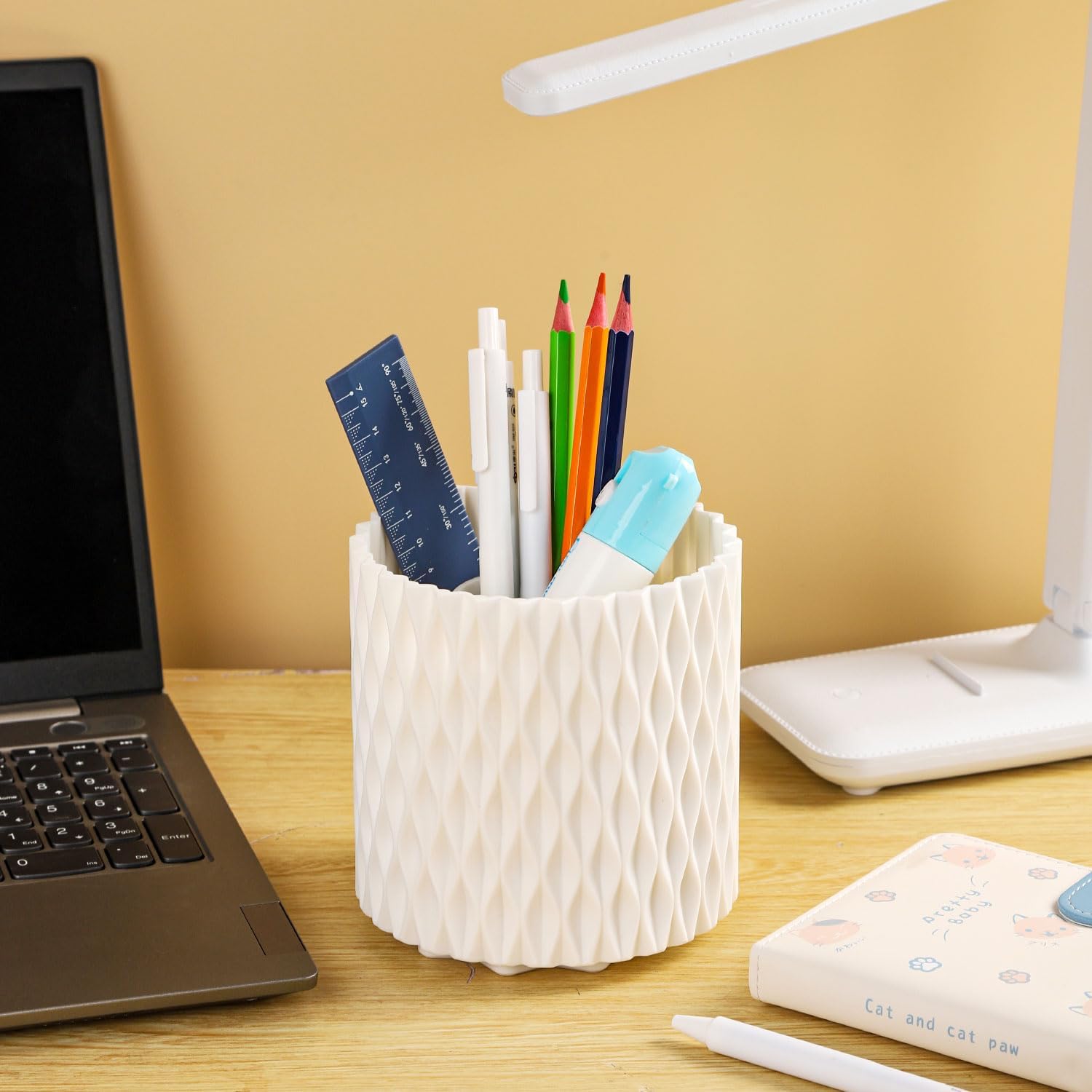 White 360° Rotating Makeup Organizer, Spinning Makeup Brush Holder, Unique Textured Makeup Brush Cups for Vanity Decor, Lipstick Holder for Bathroom Counter, Desk Storage Container