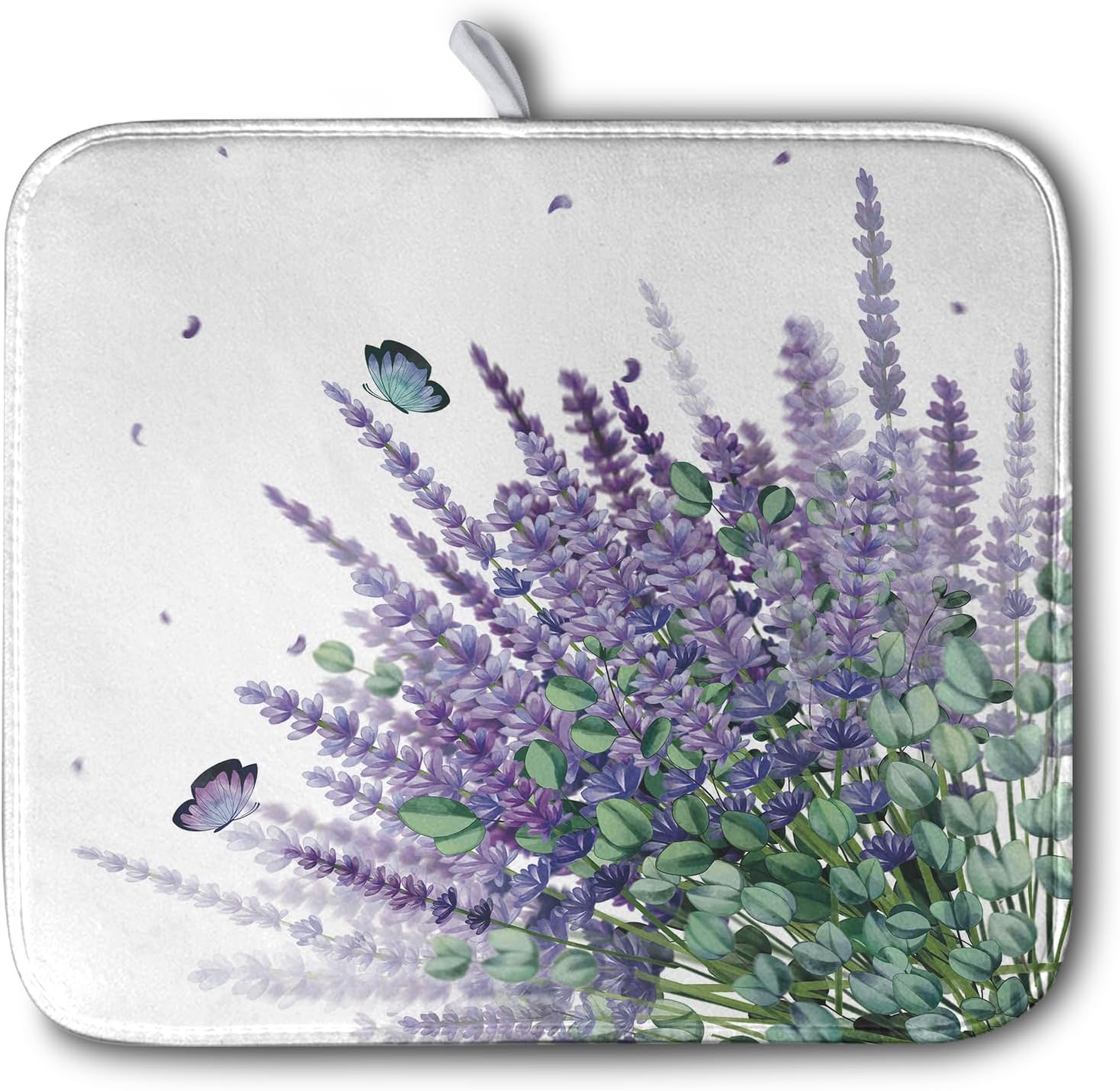 Purple Lavender Dish Drying Mat for Kitchen Counter Spring Summer Floral Microfiber Dish Drainer Mats Green Leaves Butterfly Absorbent Reversible Dish Drainer Rack Mat 16x18 Inch