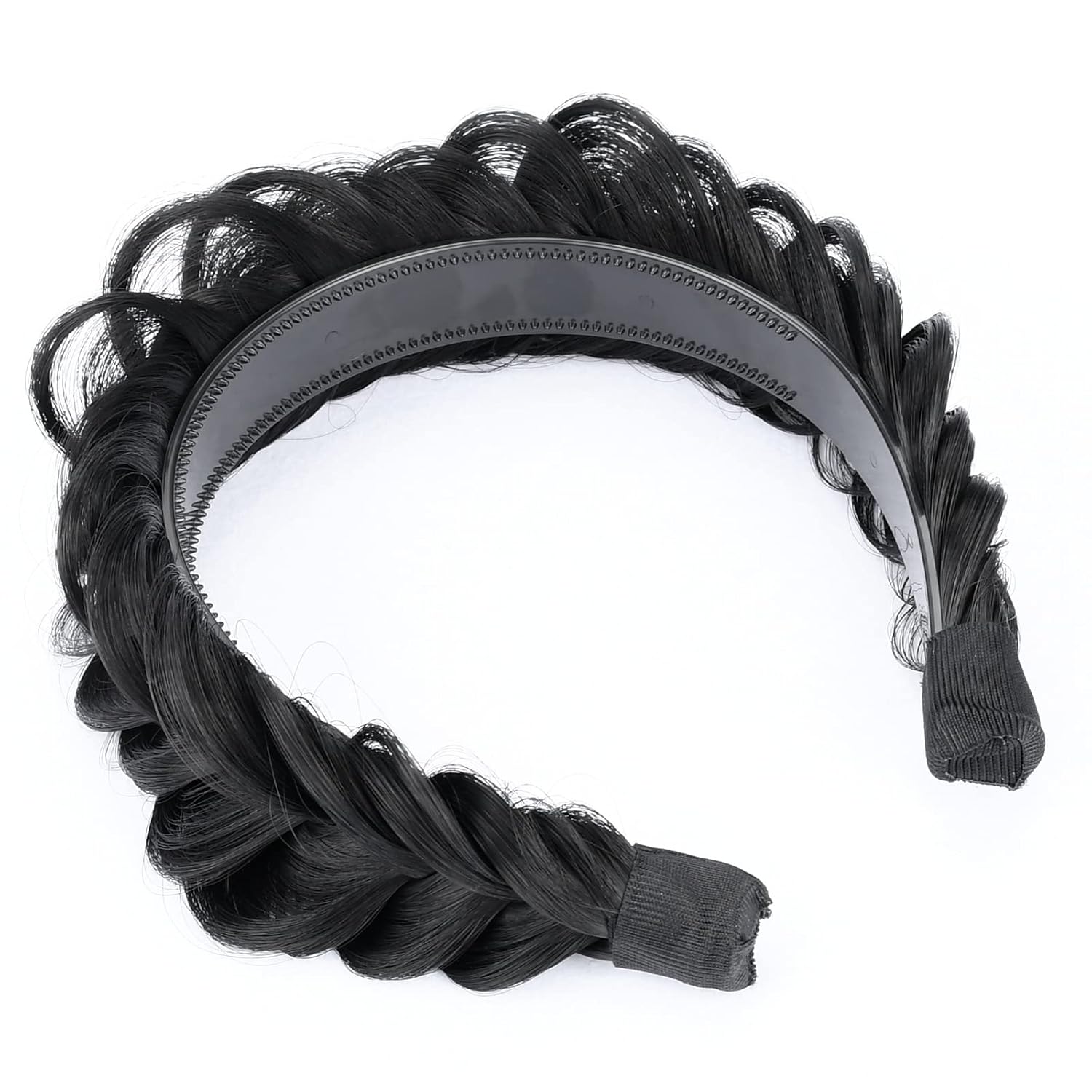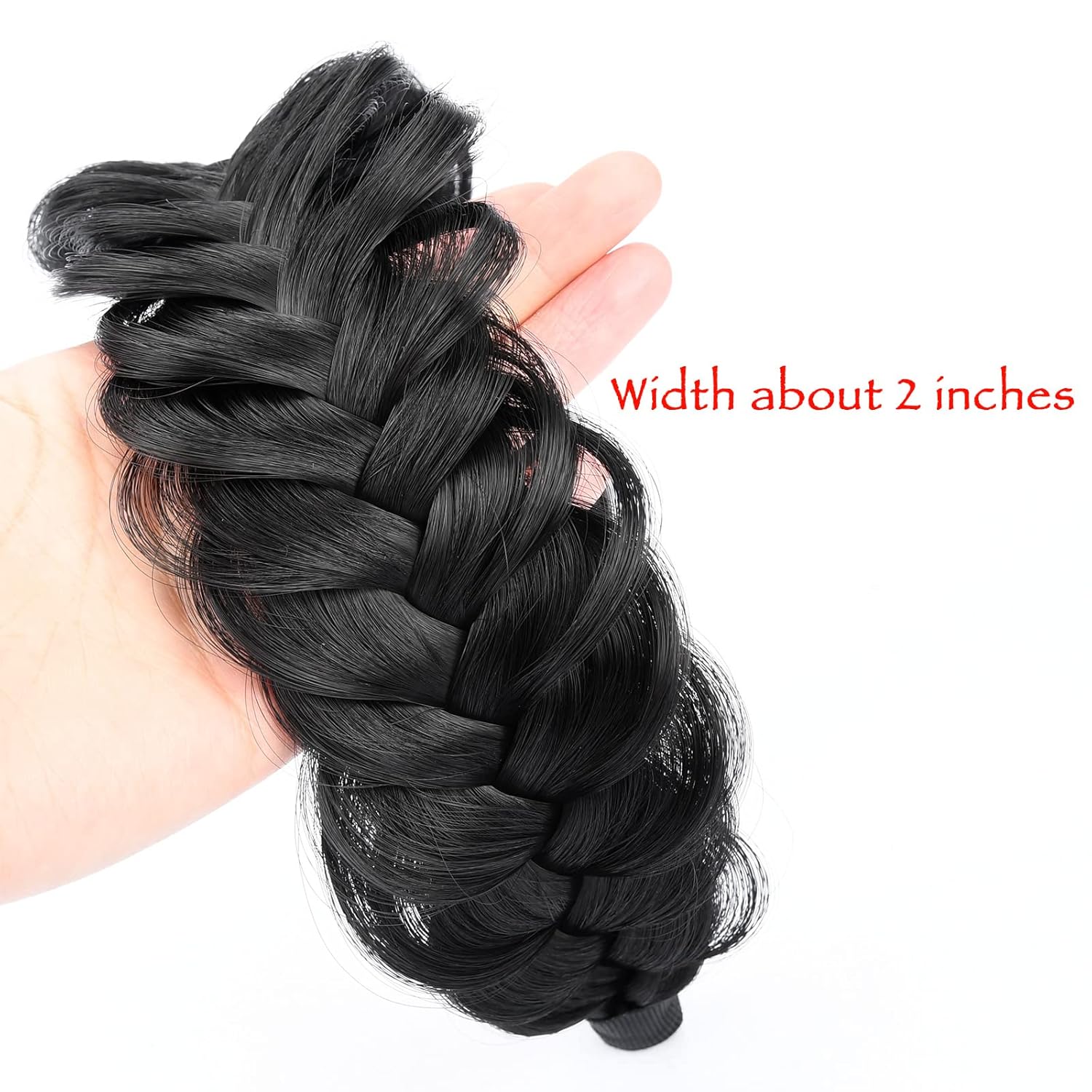 DIGUAN Wide Messy Braided Headband With Teeth Synthetic Hair Plaited Headband High Elasticity Braids Chunky Fishtail Braided Hair Band Hairpiece for Girls Women (Natural Black)