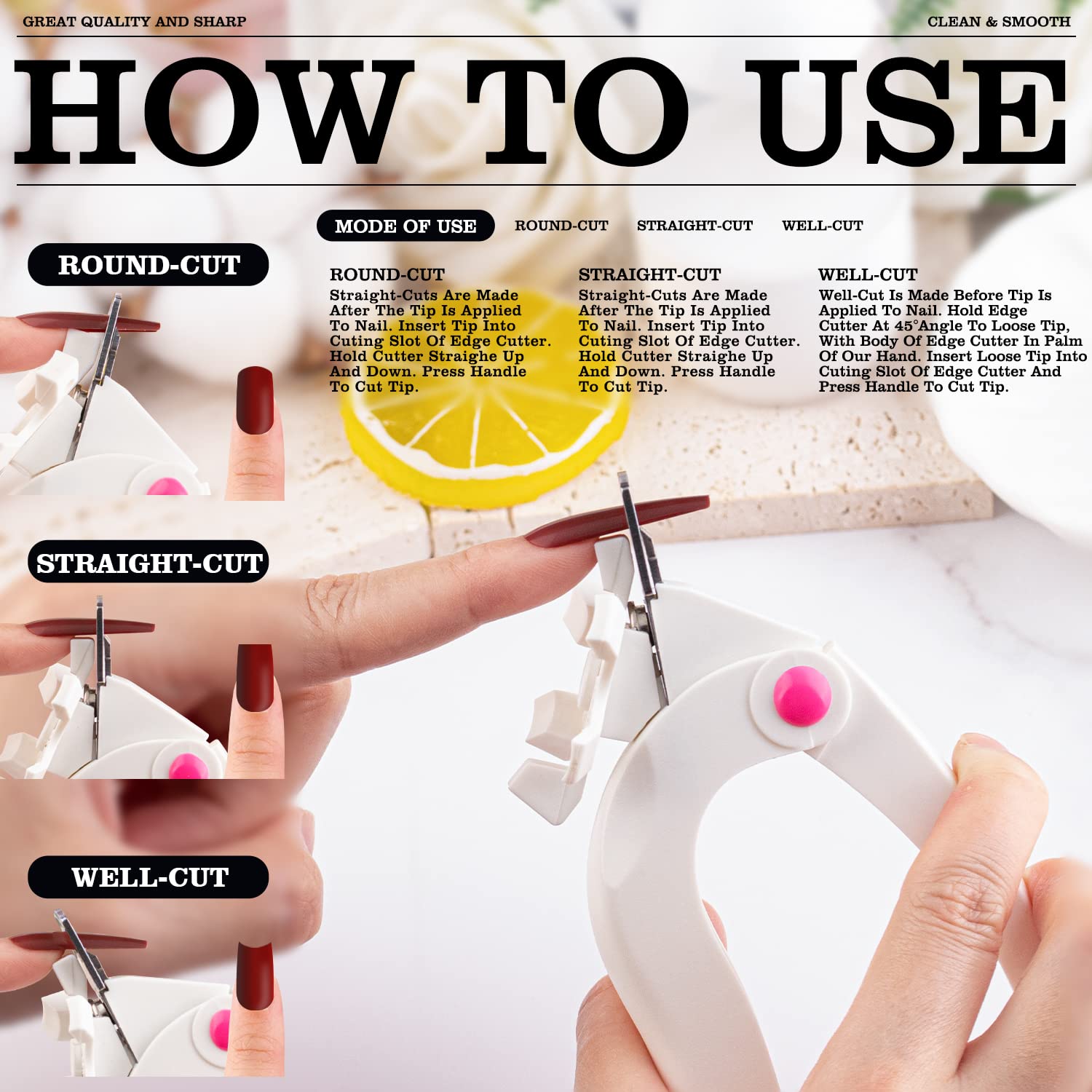 - ❤Triple Cuts & Sharp Blade -- This nail clipper has a U-shaped metal stopper that features 3 adjustable angles for a flawless manicure and nail art: hold it at 45° for round nails, 90° for square nails, and 135° for "smile" half-cover edges. Cut acrylic nails quickly and smoothly with this sharp-bladed and strong-springed cutter. The sharpness of blade makes cutting nail tips a breeze.