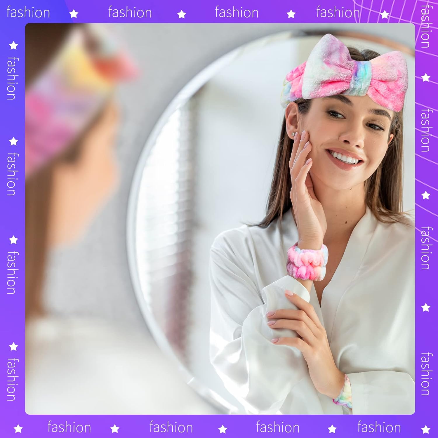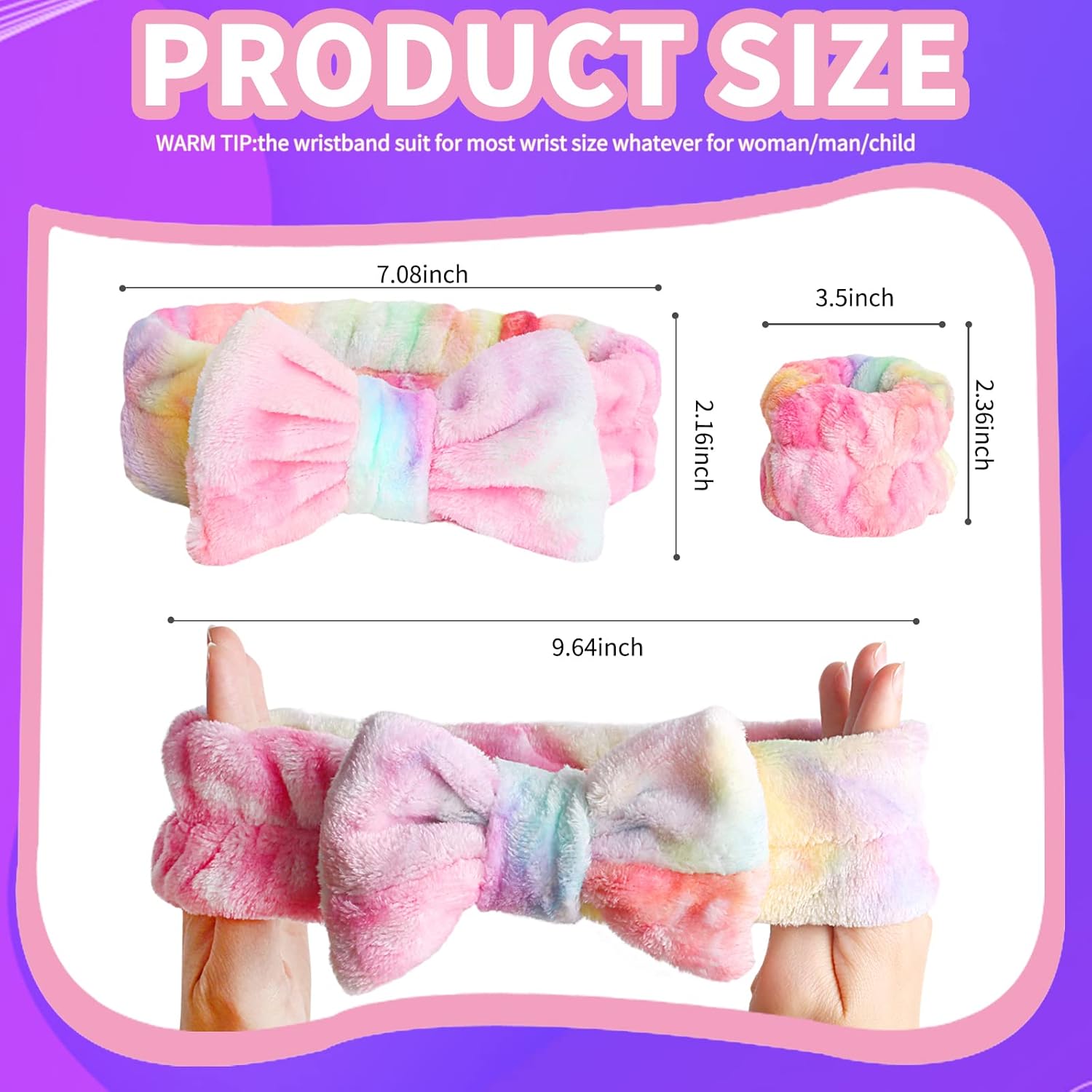 - Stylish Tie dye skincare headband : The unique bright tye dye pink color have adorable bow tie shape on the top of headband in, makes you extraordinary sweet and cute. The bows themselves are not sew into the headband, so they are removable and can mix and match if that something you're interested in. And the fluffy soft wristband like a beautiful flower on your wrist, make you feel super relaxed and comfy.