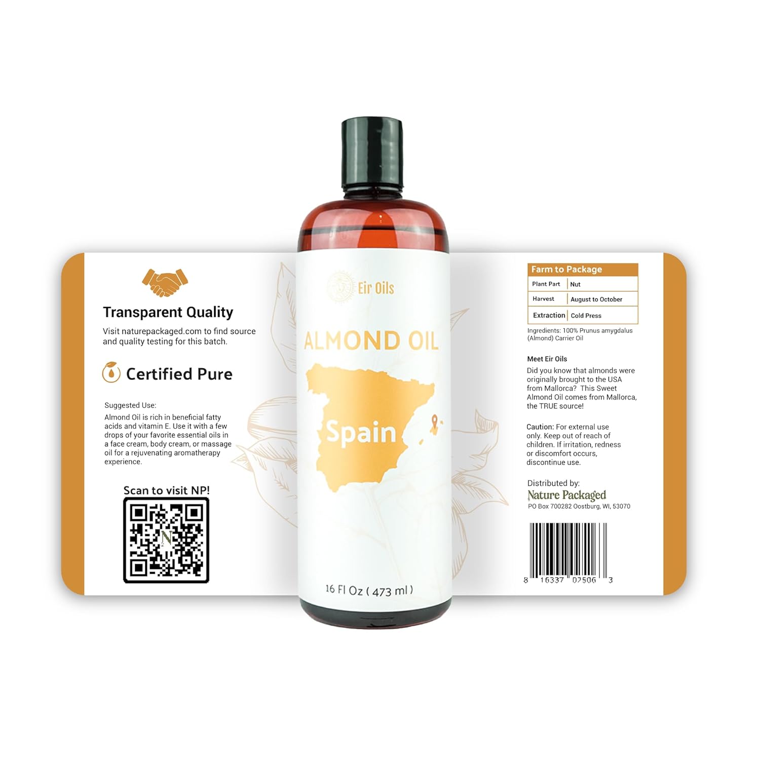 Sweet Almond Oil (16 oz) - for Skin and Hair - Carrier Oil for Essential Oils Mixing - From EIR Oils' Farm in Mallorca, Spain - 2 Packs
