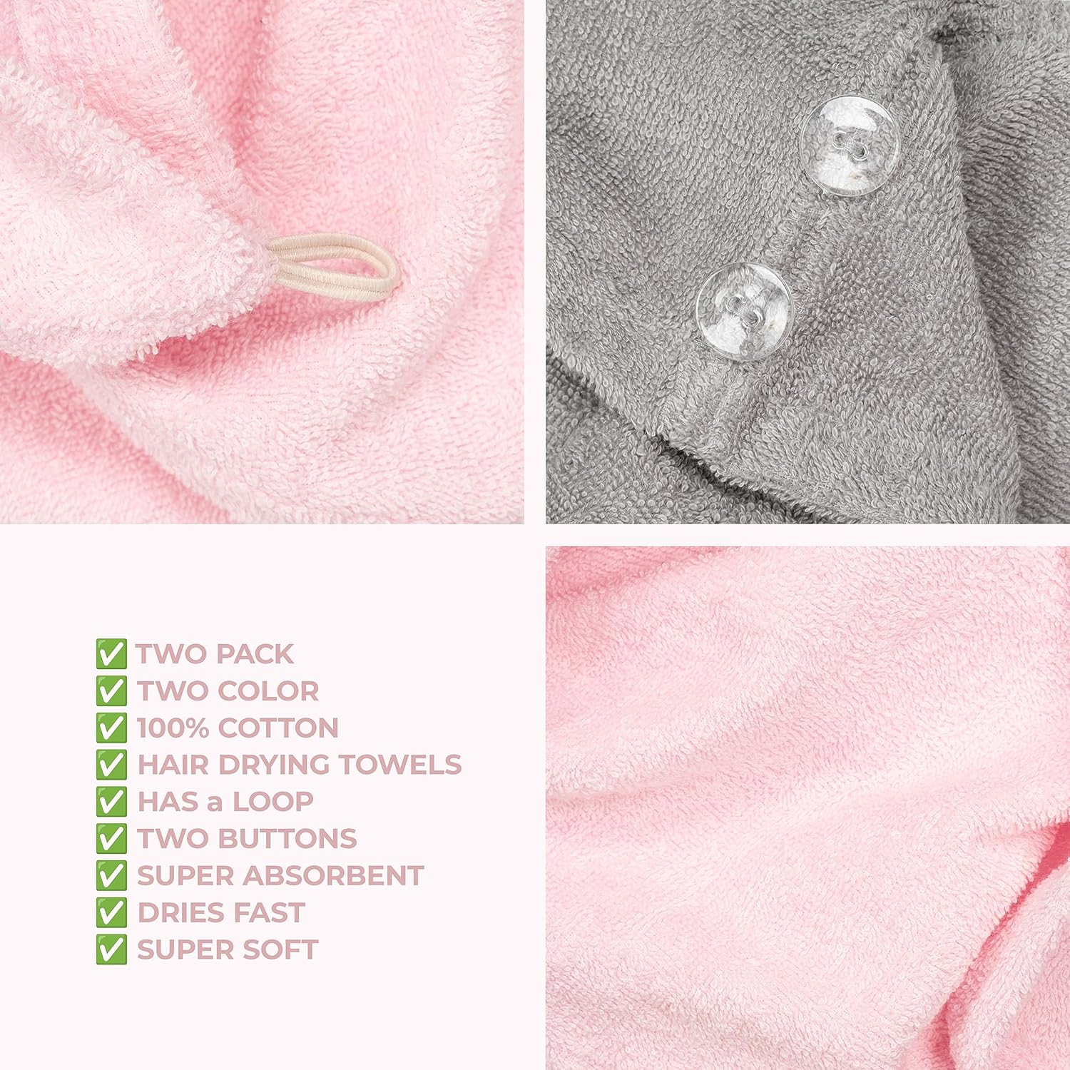American Soft Linen 100% Cotton Head Towel Cap, Women's Anti Frizz Hair Wrap, Absorbent Cotton Towels 2 Pack, Light Grey-Pink