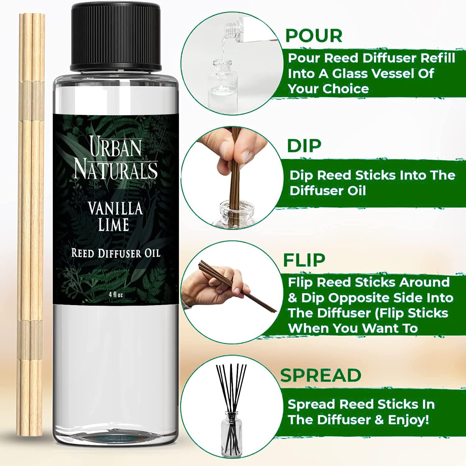 Urban Naturals Reed Diffuser Oil Refill, Vanilla Lime Citrus Essential Oils with Cane Sugar, Lime, Vanilla, 4 oz + Free Reed Sticks, Made in The USA