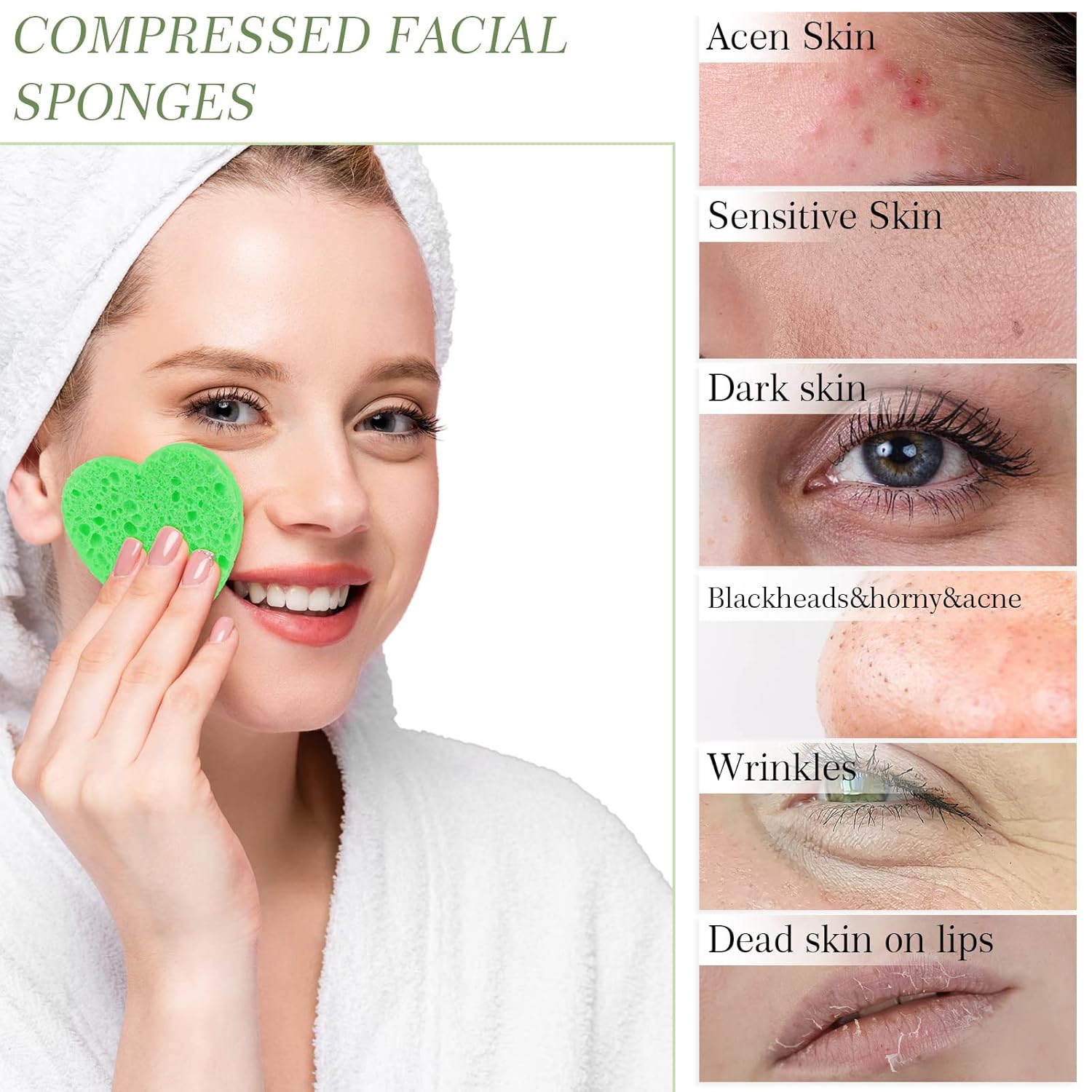 Sieral 120 Pcs Compressed Facial Sponges with Container Disposable Face Sponge Pads for Washing Face Cleansing Exfoliating Esthetician Makeup Removal(Heart,Green)