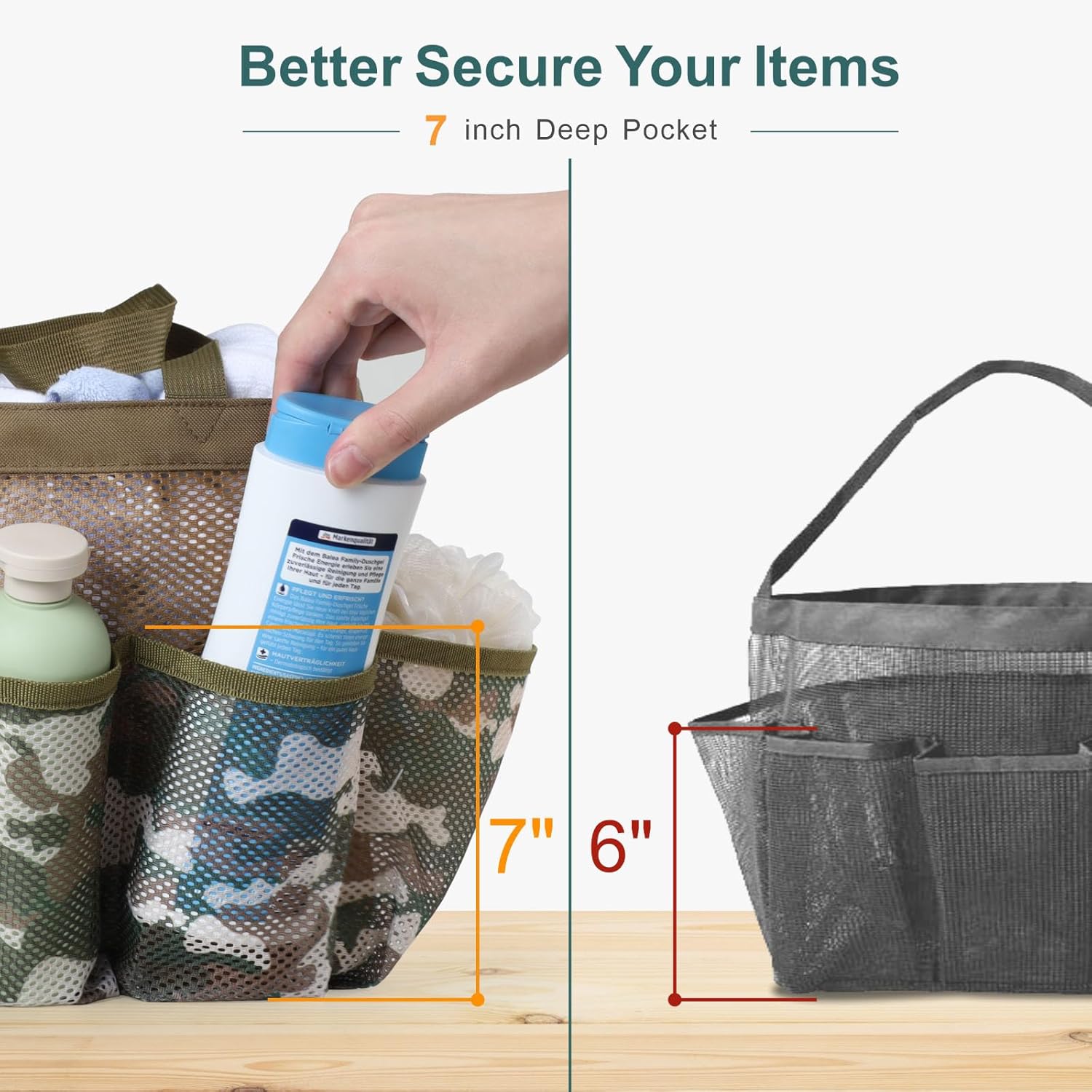 - 7 Upgraded Deep Pockets for Extra Security: With seven exterior pockets (7" deep), this shower tote bag keeps tall bottles upright and secure—no spills or lost items, even on the go
