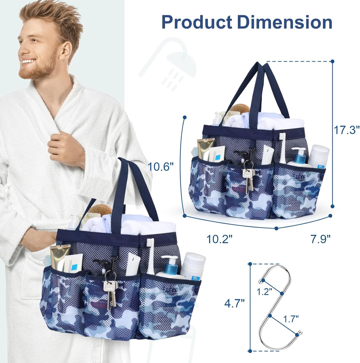 F-color Shower Caddy Portable - Mesh Shower Bag Basket Tote for College Dorm Room Essentials Bathroom Gym Camp Quick Dry for Women Men with S Hook, Dark Blue Camouflage