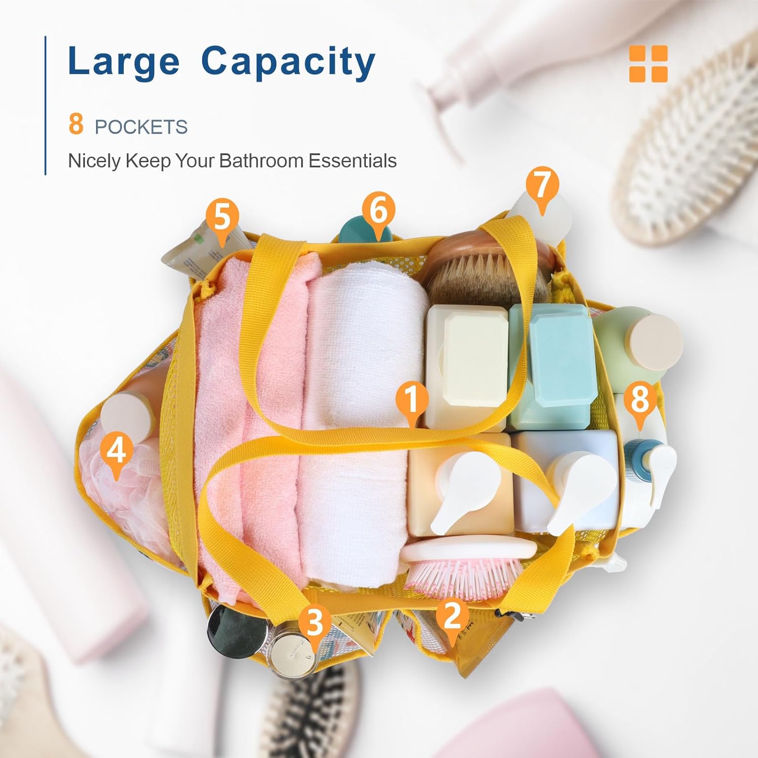 F-color Shower Caddy Portable - Mesh Shower Bag Basket Tote for College Dorm Room Essentials Bathroom Gym Camp Quick Dry for Women Men with S Hook, Yellow Beach
