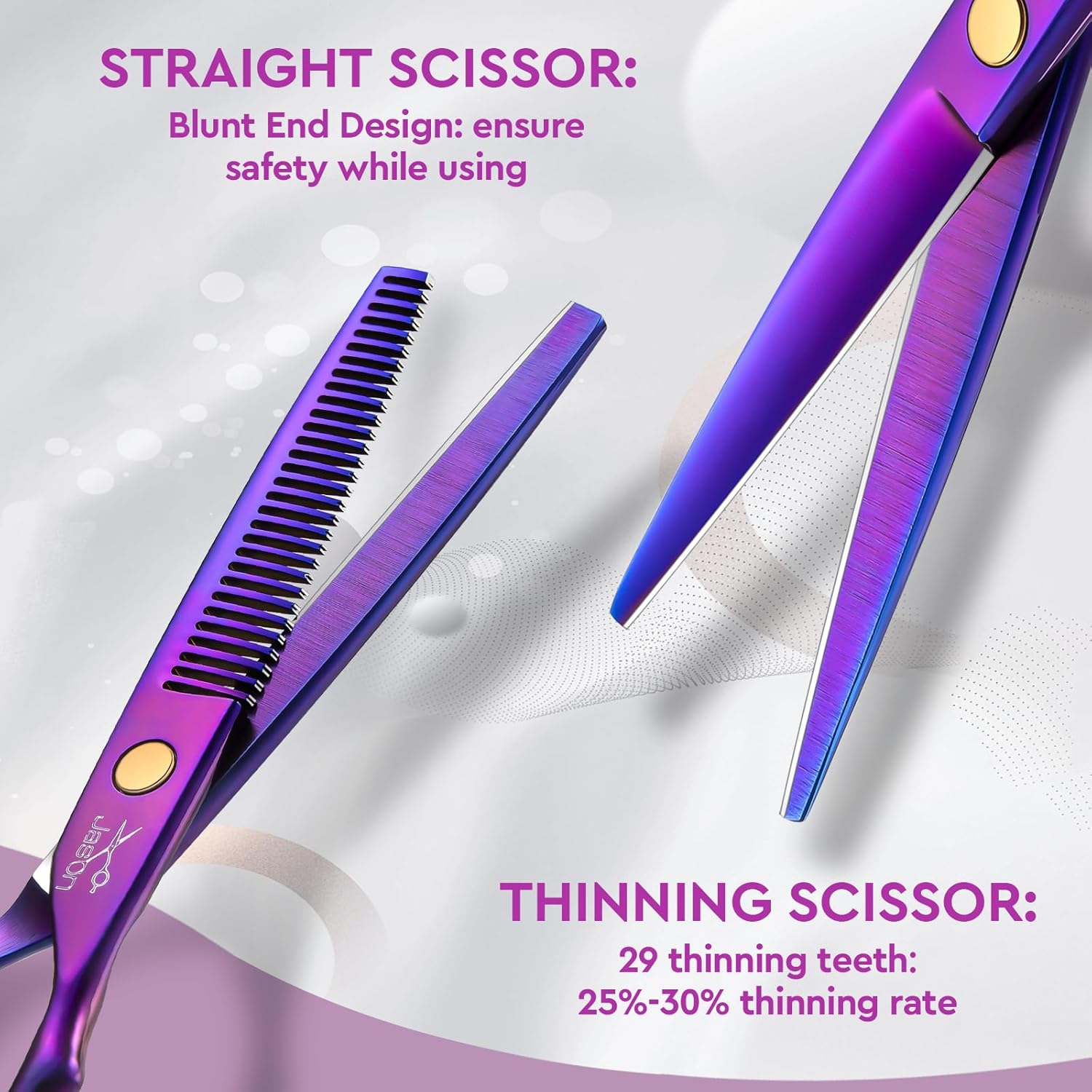 JASON Hair Scissors Professional - 10 PCS Haircut Scissors Set, Thinning Shears for Hair Cutting with 30 Teeth, Straight Shears for Men Women Home Salon Barber (6.7", Purple)