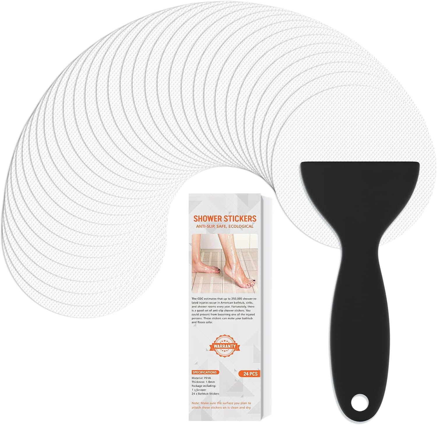 Non Slip Bathtub Stickers, 24 PCS Shower Stickers for Safety Bathroom Tubs, Bathtub Non Slip Stickers and Adhesive Decals Scraper for Bath Tub, Shower Floor, Stairs, Ladders(Round Shape, White)