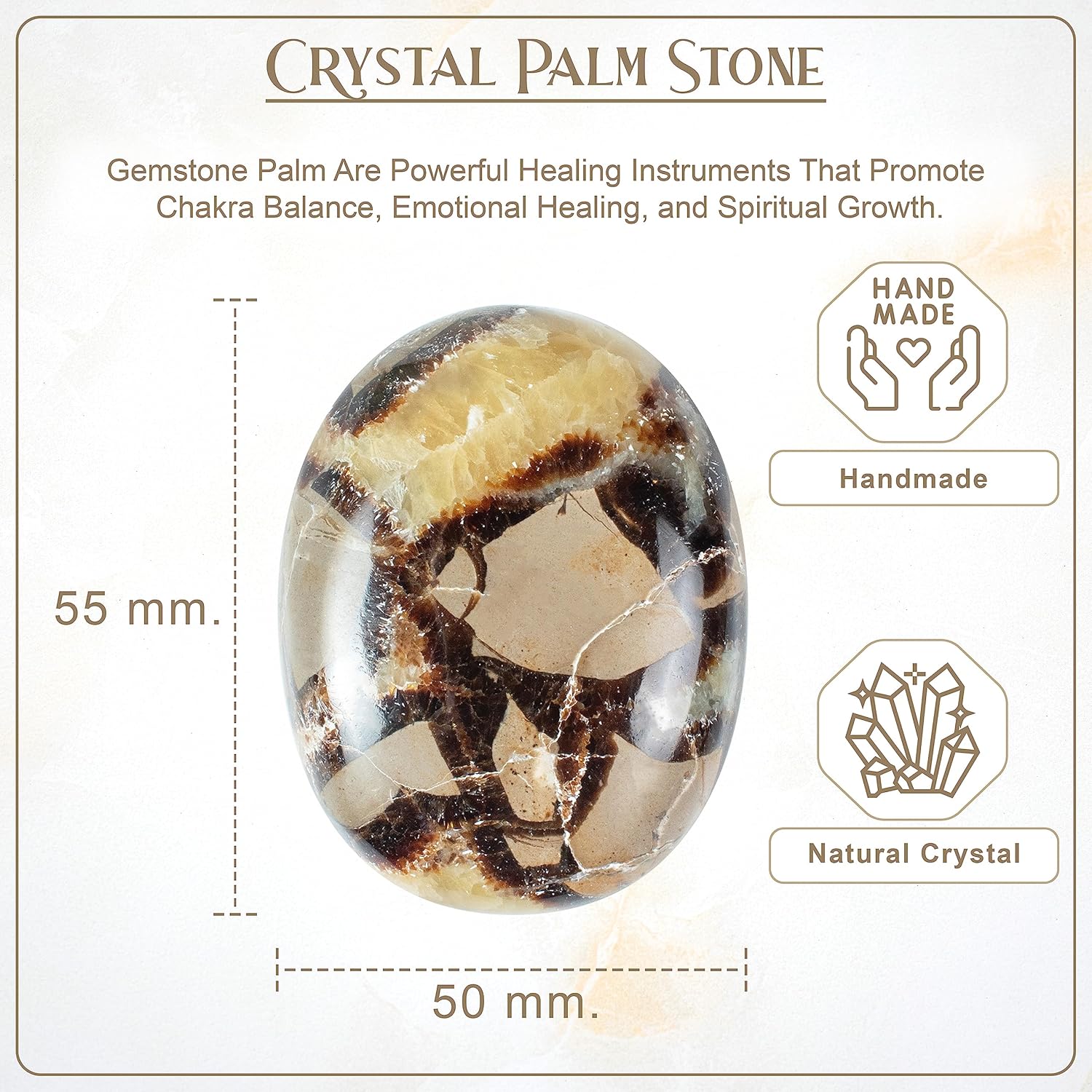 - "? Attention : You will receive similar to the photograph; however, each Handmade palm stone contains a natural stone and will vary slightly in shapes. Absolute care will be taken with packing. However, the Properties and Healing Qualities will be excellent."
