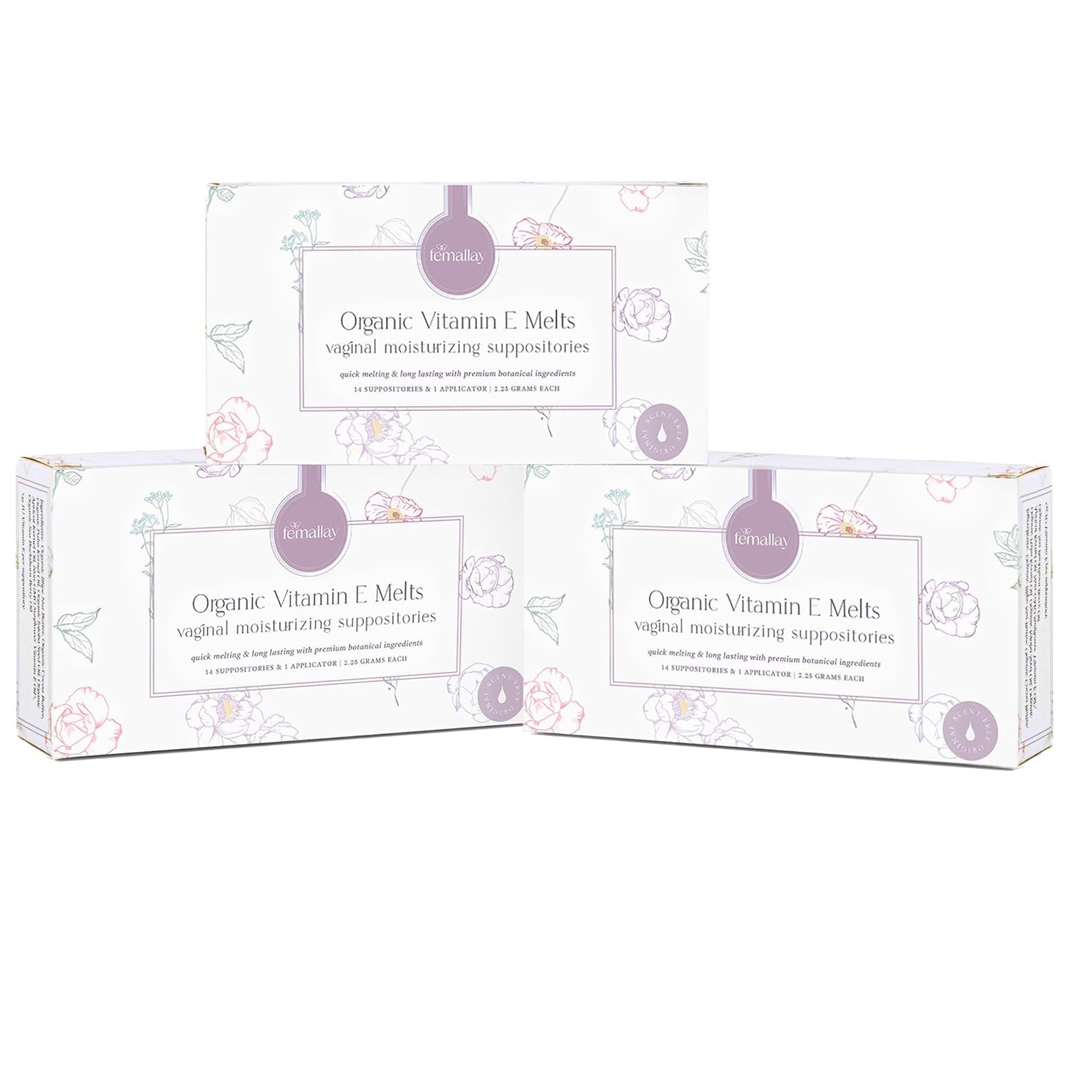 Femallay Organic Vitamin E Vaginal Moisturizing Suppository Melts - 3 Pack - Relief for Menopause Dryness & Irritation - 14 Count + Applicator