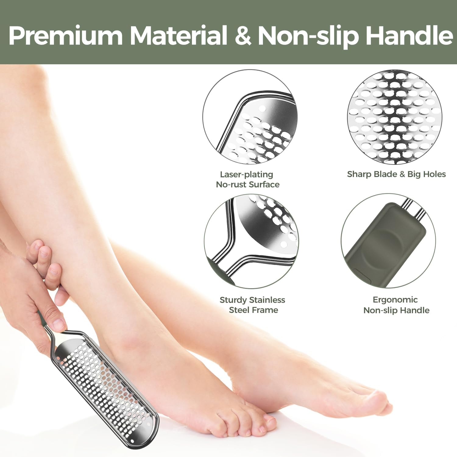 - INTEGRATED DESIGN - The whole frame is made of stainless steel, connected to the handle, which avoids handle breaking by overpressure. Just hold the anti-slip handle and press the concave, the hard-dead corns that are hard-to-reach calluses removed easily! The best choice for preparing for the sandal season and the elders