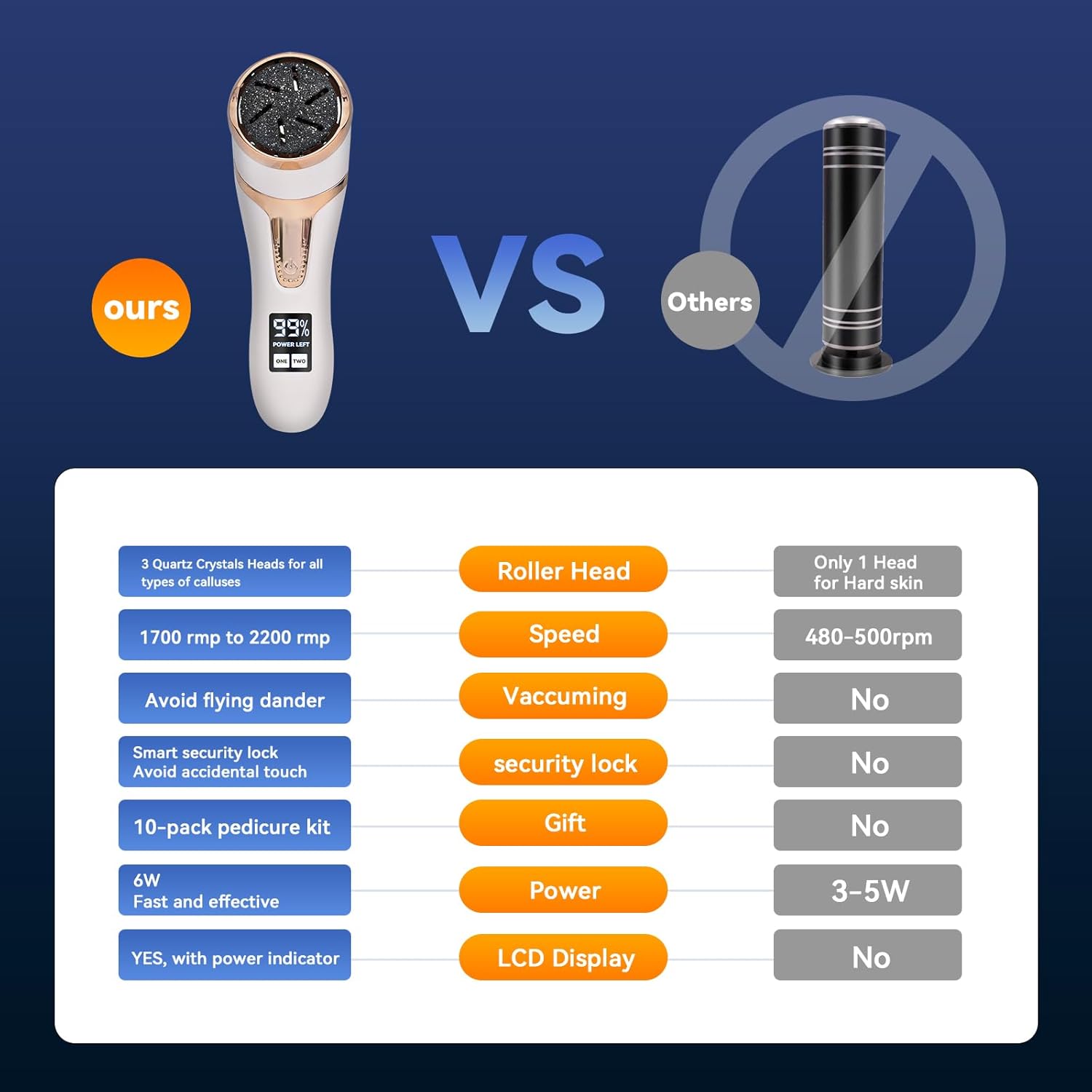 - 【Powerful Electric Callus Remover with Vacuum】Built in 2 powerful 6W motors, this foot callus remover can provide 2200RPM and achieve faster removal of hard dead skin. With a unique vacuum design, this callus remover can quickly remove foot debris or dead skin without worrying about getting the floor dirty when grinding feet, which is very user-friendly and practical.