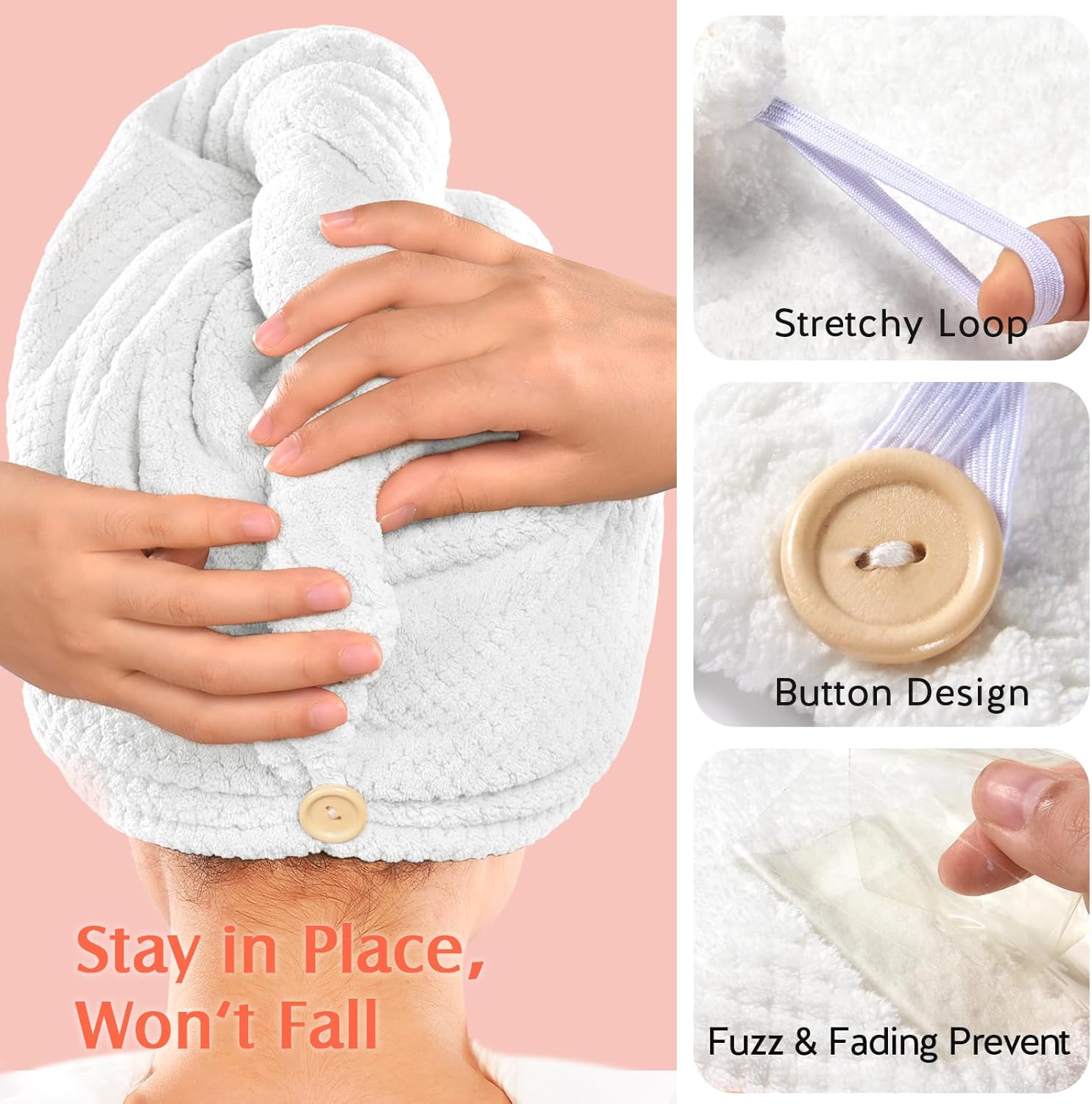 YFONG 2 Pack Microfiber Hair Towel Wrap for Women, Super Absorbent Quick Dry Hair Turban for All Hair Style Anti Frizz, Large Hair Drying Towel with Button