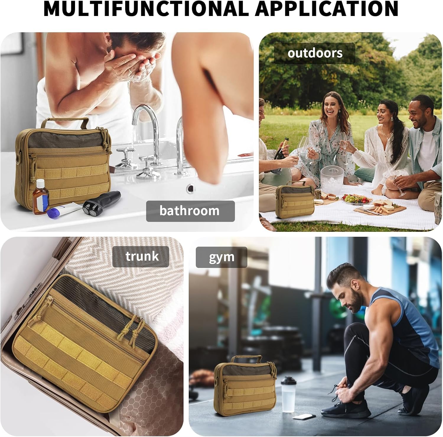 - Multi-Functional Hanging Toiletry Bag for Men - Built-In 360° Rotating Hook for Bathroom/Campsite Use + Front MOLLE Panel Compatible with Carabiners & Accessories, Back Zipper Pocket Secures Valuables.
