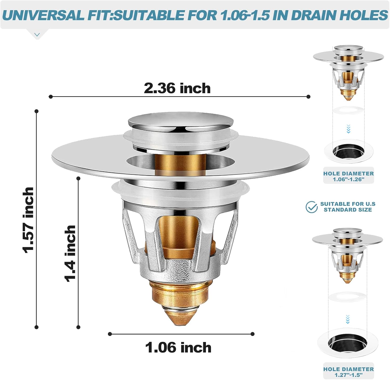 - 2.Easy to Use Pop Up Design: Our Pop Up Sink Drain Stopper is designed for convenience. Simply push down to seal the drain or pop up to quickly release the water. No more hassle with traditional stoppers that get stuck or fail to seal properly.