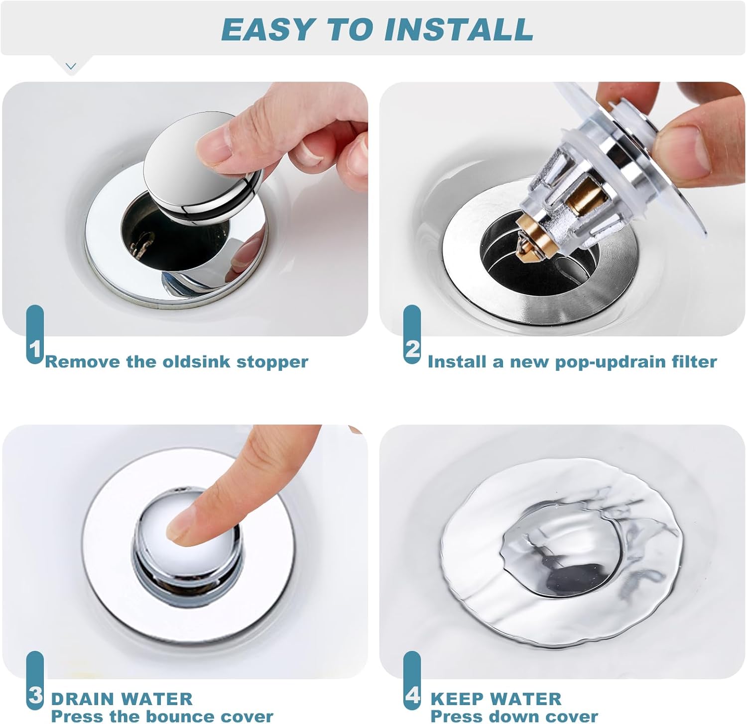 - 4.Durability and Stylish: Made from high-quality materials, our sink drain stopper is built to last. With its chrome-plated finish, it not only functions flawlessly but also adds a touch of elegance to your bathroom decor.