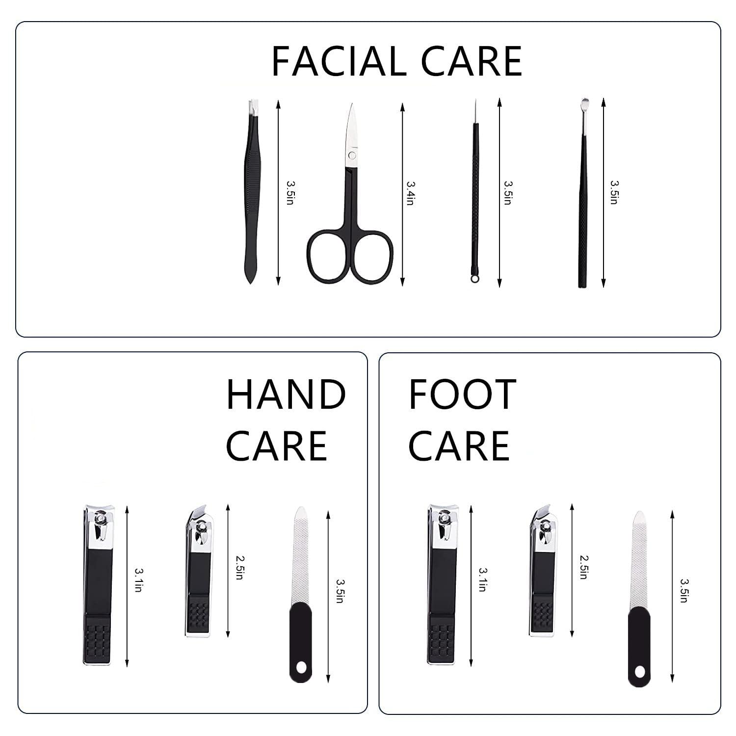 - [Multi-Functional Manicure Set] Manicure Set Contains 7 pieces facial, nail and toenail tools that covers three major functions for hand care, facial care, foot care: large nail clippers, small oblique nail clippers, eyebrow scissors, eyebrow tweezer, ear pick, nail file, acne needle. Premium manicure kit and nail grooming kit for men, boys, teenagers, seniors, women and girls.