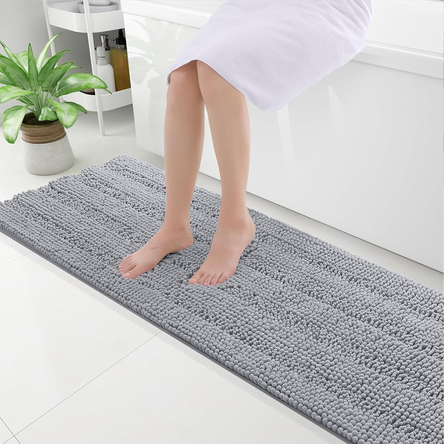 Grandaily Chenille Striped Bathroom Rugs 59x20, Extra Thick and Absorbent Bath Mats, Non-Slip Soft Plush Shaggy Shower Carpet, Machine Wash Dry, Bath Rug for Bathroom, Light Grey