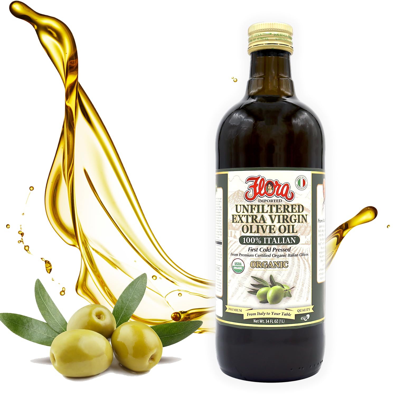 Organic Unfiltered Extra Virgin Olive Oil 1 Liter Bottle | Flora Foods | 100% Authentic Italian (34 Fl Oz /1L) Imported