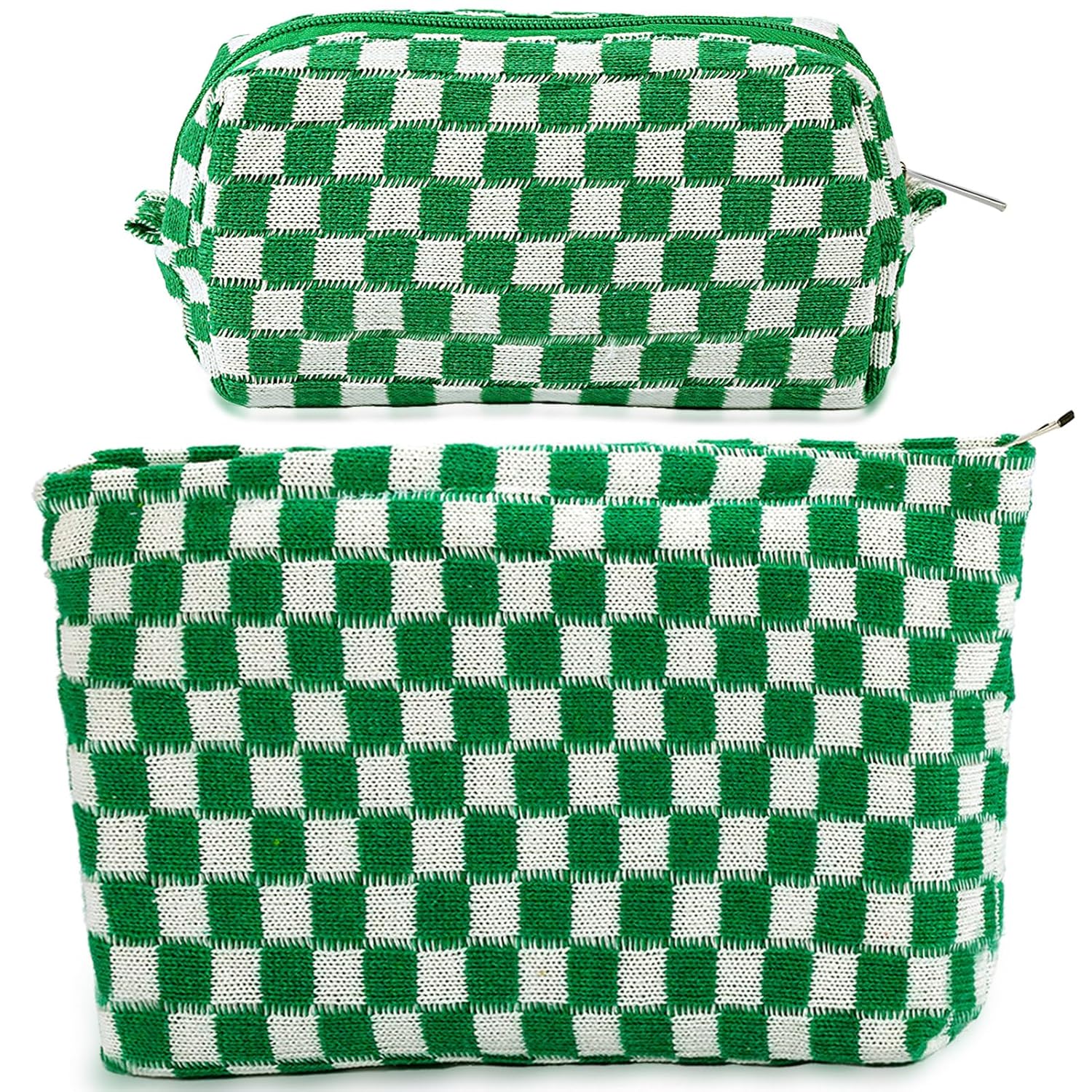 ZLFSRQ 2Pcs Checkered Makeup Bag for Women Large Small Checkered Cosmetic Bag Set Aesthetic Preppy Pencil Case Cute Pencil Pouch Green Makeup Pouch for Purse Travel Toiletry Bags Zipper Skincare Bags