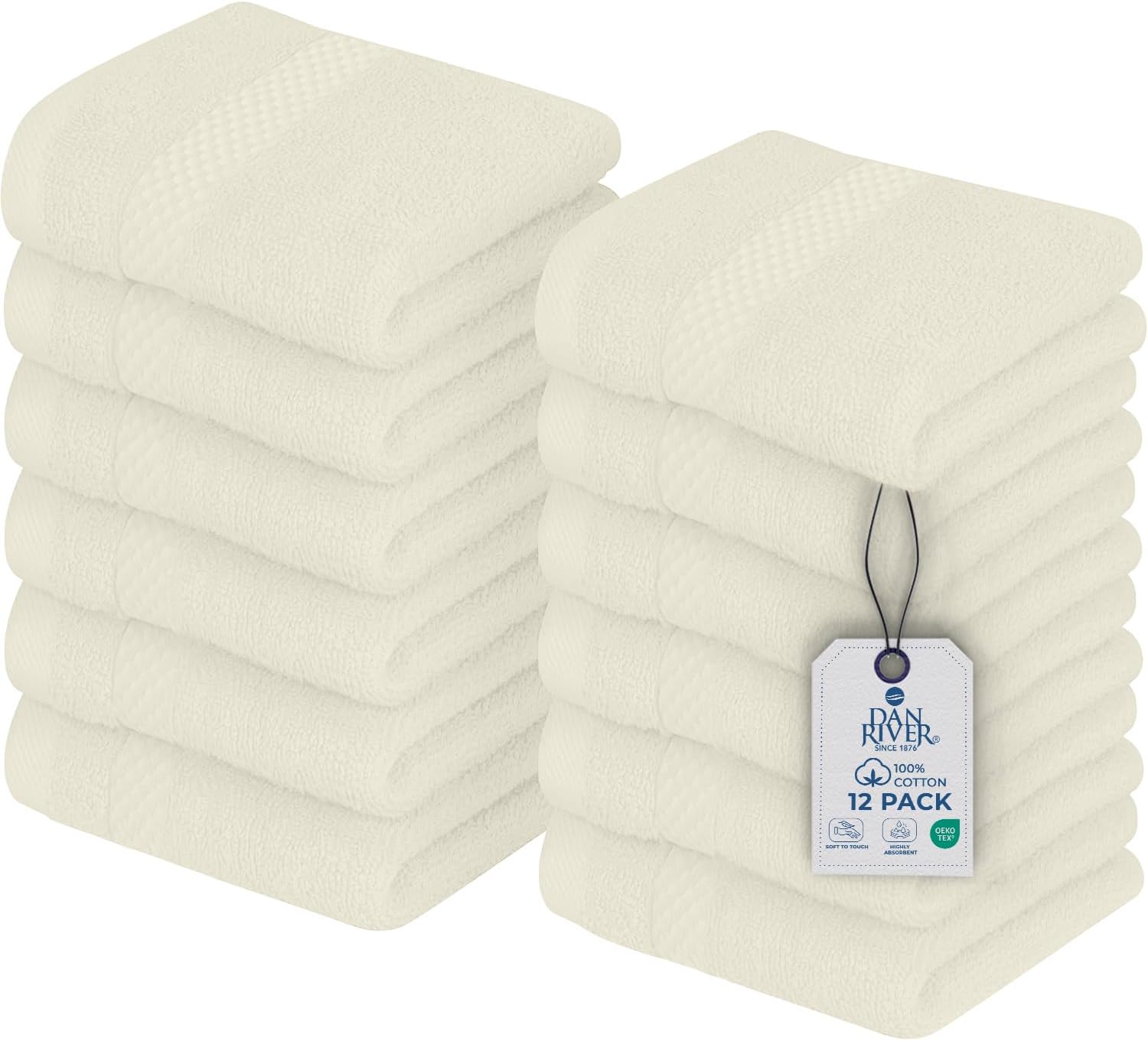 DAN RIVER 12-Pack Premium 100% Cotton Ivory Face Towels – Reusable Face Towel Set, Soft & Absorbent Washcloths for Bathroom & Body – Hand and Face Towels, 550 GSM (12x12 in)