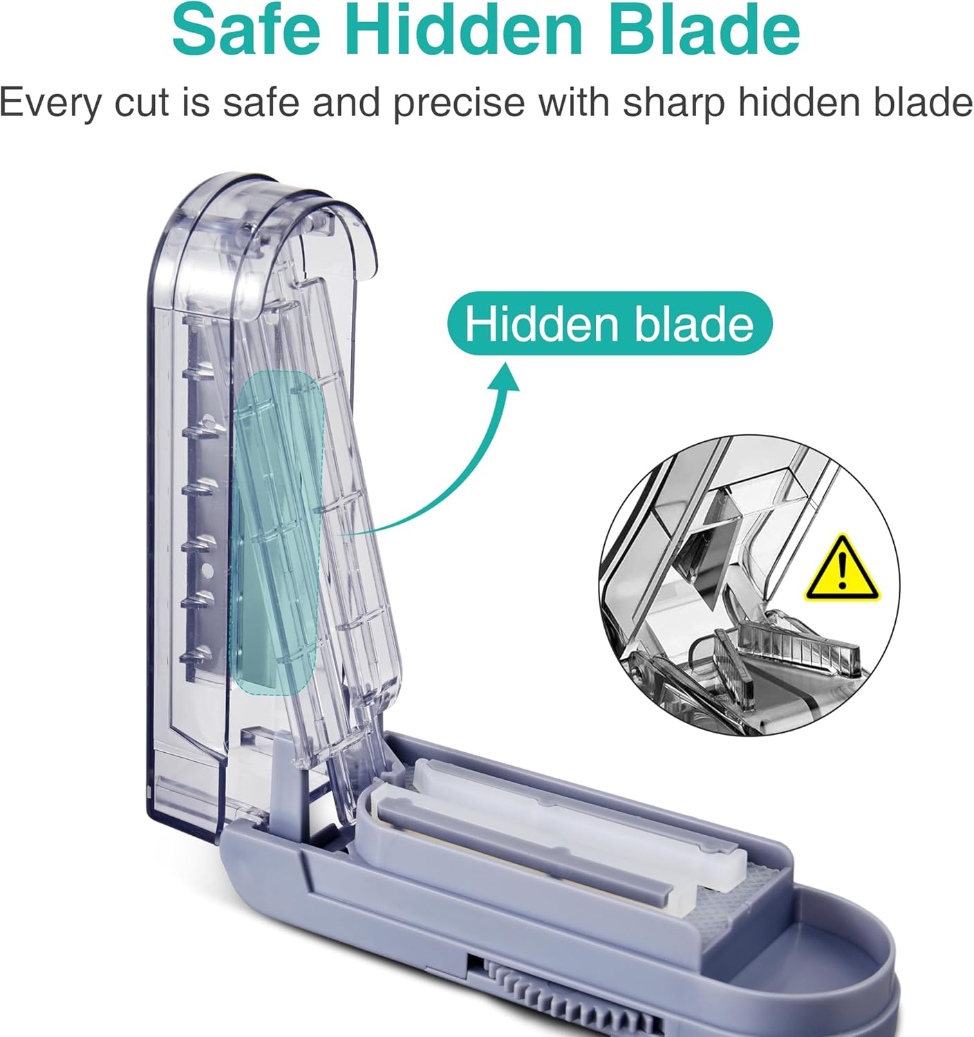 - 【Sharp but Safe】Ensuring safety & precision, the sharp stainless cutting blade in the small pill cutter is securely covered, preventing any injuries during preparation & ensuring precise dosing. Besides keeping you safe, it also ensures the safety of your family. No need to worry about kids accidentally getting hurt when you're not watching