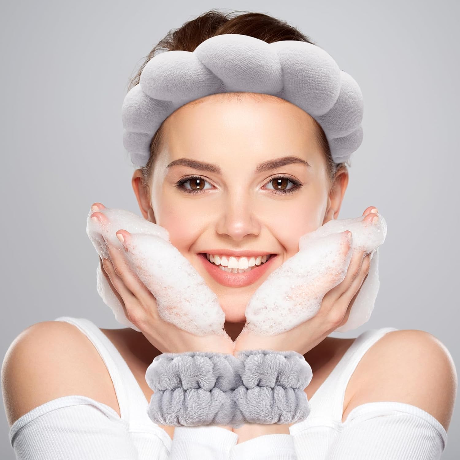 Zkptops Spa Headband for Washing Face Wristband Set Sponge Makeup Skincare Headband Terry Cloth Bubble Soft Get Ready Hairbands for Women Girl Puffy Padded Headwear Non Slip Thick Hair Accessory(Grey)