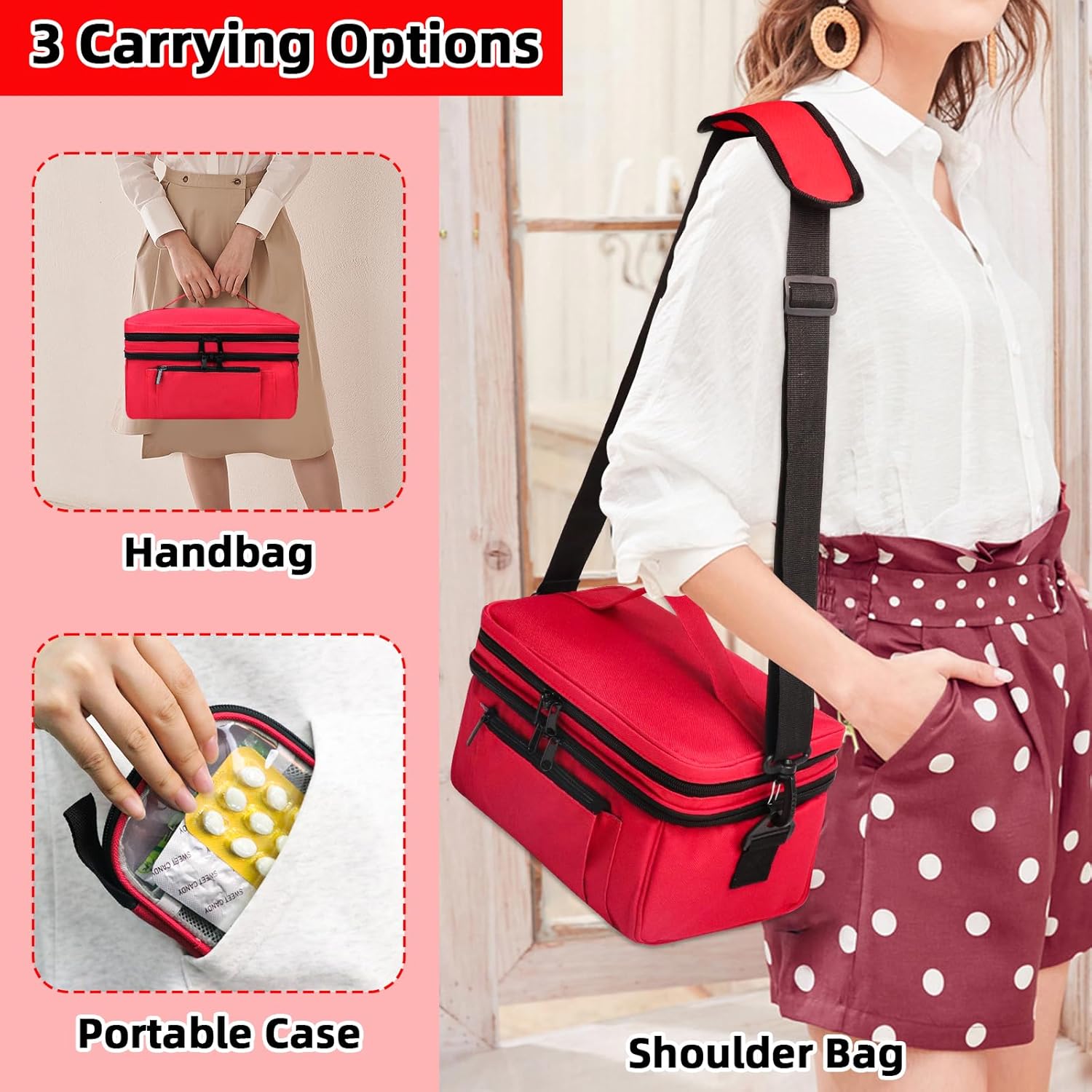 Medicine Bag for Traveling with Portable Small Pouch, Double Layer Pill Bottle Organizer Storage Case with Lockable Zippers, Carrying Medication Travel Case with Shoulder Strap (Bag ONLY), Red