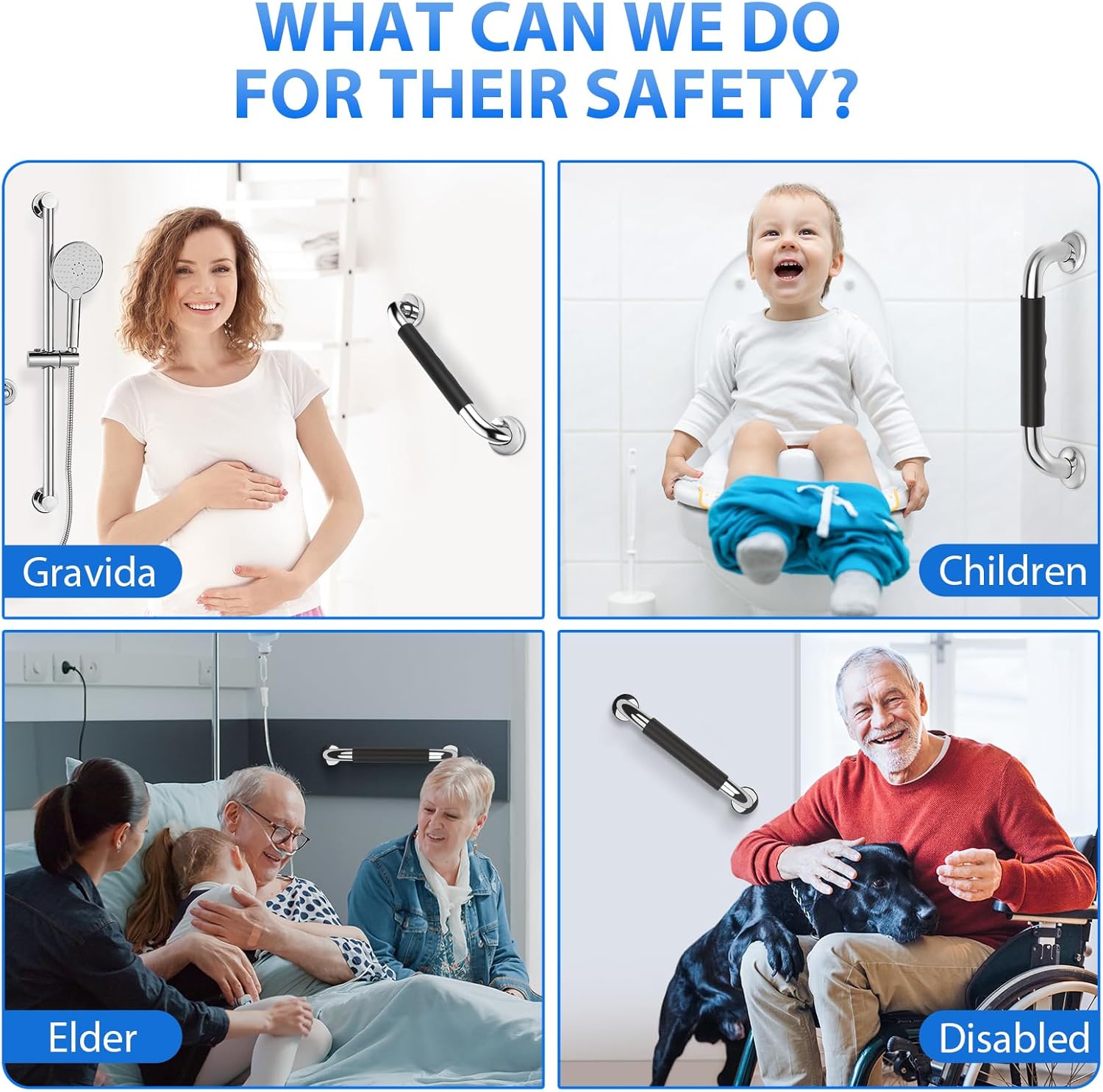 - SUPERB MATERIAL : The shower grab bars for elderly is made of stainless steeland silicone, waterproof and sturdy. Pulling up to 500 pounds,the elderly, seniors, Handicap, pregnant, the injured, children provide stability and balance, and create a safe bathroom and staircase experience for your family.These handicap grab bars are only used to assist and properly support part of the weight of the body, not all of it.