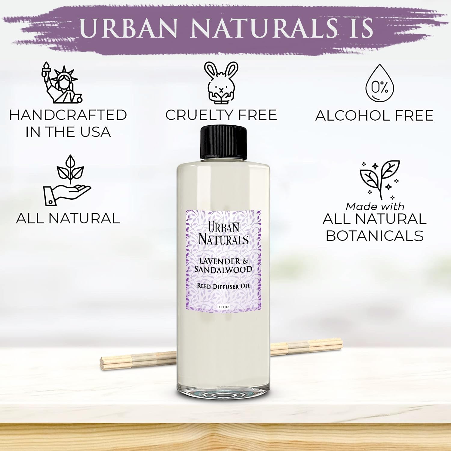 Urban Naturals Reed Diffuser Oil Refill Lavender Sandalwood with Golden Amber, Exotic Woods, Patchouli 8 oz + Free Reed Sticks, Made in The USA