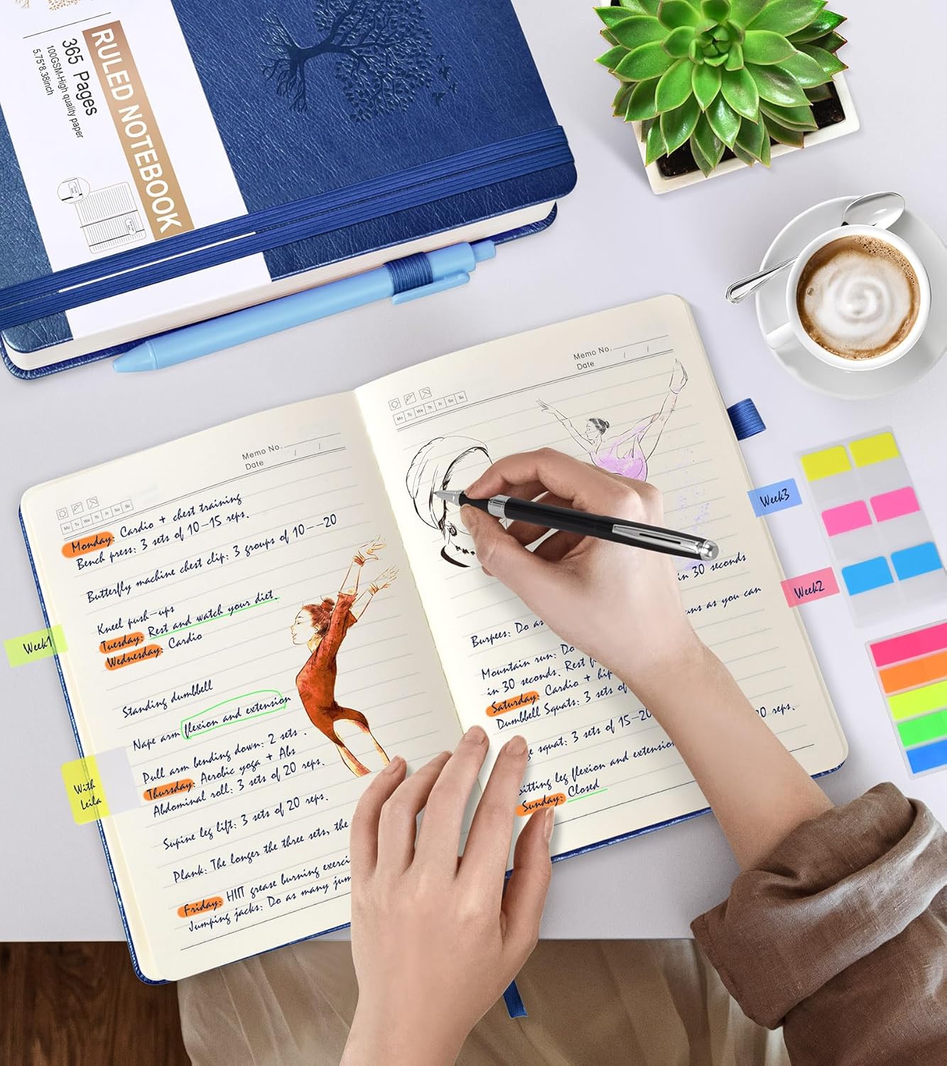 - 【365 Pages&100Gsm Thick Journal】Large A5 size (5.75"x 8.38"/146mm x 213mm), 8mm space classic college ruled notebook, total 365 pages, include 64 perforated pages. 100gsm acid free light Ivory paper that is thicker than normal, will not cause bleeding, ghosting or smudging and is suit for most types pens.