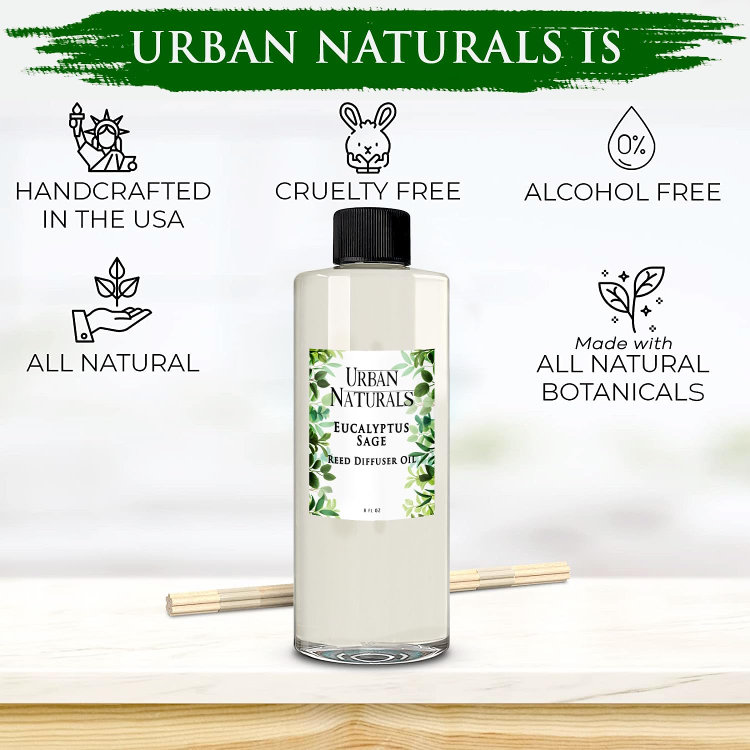 Urban Naturals Reed Diffuser Oil Refill Eucalyptus Sage with Mint, Lime, Cedarwood 8 oz + Free Reed Sticks, Made in The USA