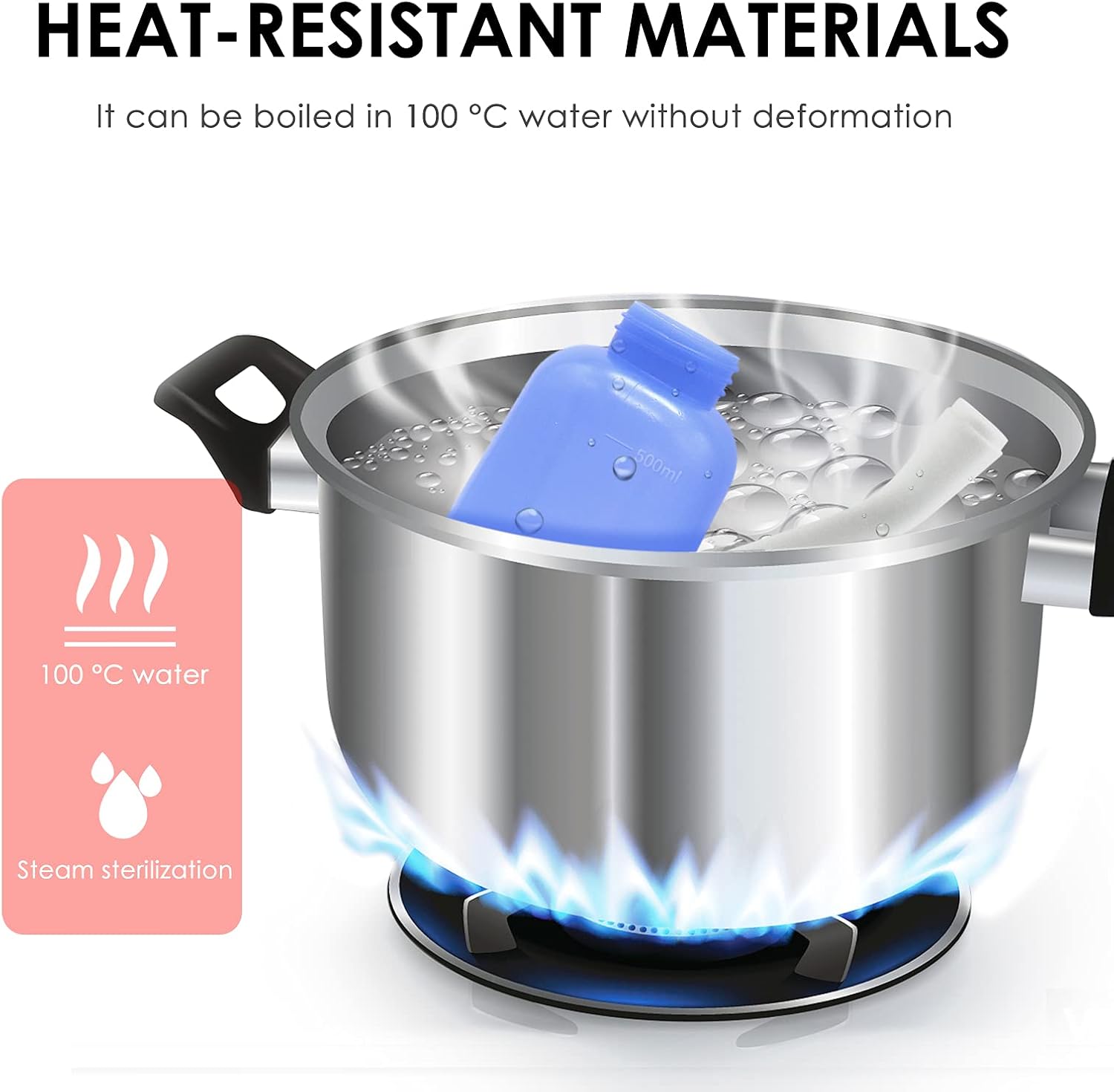 - HIGH TEMPERATURE RESISTANCE: The bottle body is made of TPE material, a soft, flexible material which has the properties and performance of rubber. It can be boiled in 100℃ (212℉) water for disinfection without being deformed by heat. TPE meterial is greener and eco-friendly than EVA and can be processed like plastic and recyclable.