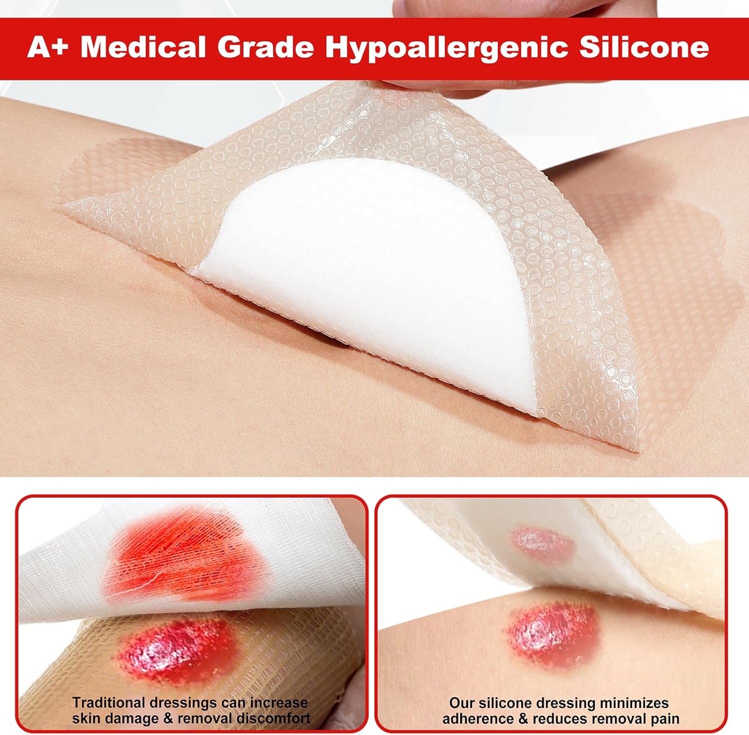 - Silicone Adhesion & Painless Removal: Our dressings employ medical-grade hypoallergenic silicone as a wound contact layer. It is designed to adhere to dry skin without sticking to moist wounds, ensuring gentle, painless removal, minimizing trauma during dressing changes, and absorbing dead tissue cells for uninterrupted healing.