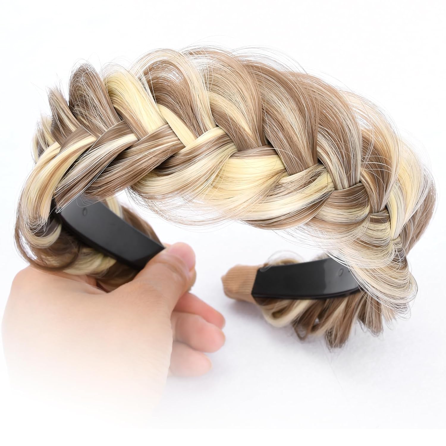 DIGUAN Wide Messy Braided Headband With Teeth Synthetic Hair Plaited Headband High Elasticity Braids Chunky Fishtail Braided Hair Band Hairpiece for Girls Wome (Light Highlighted)