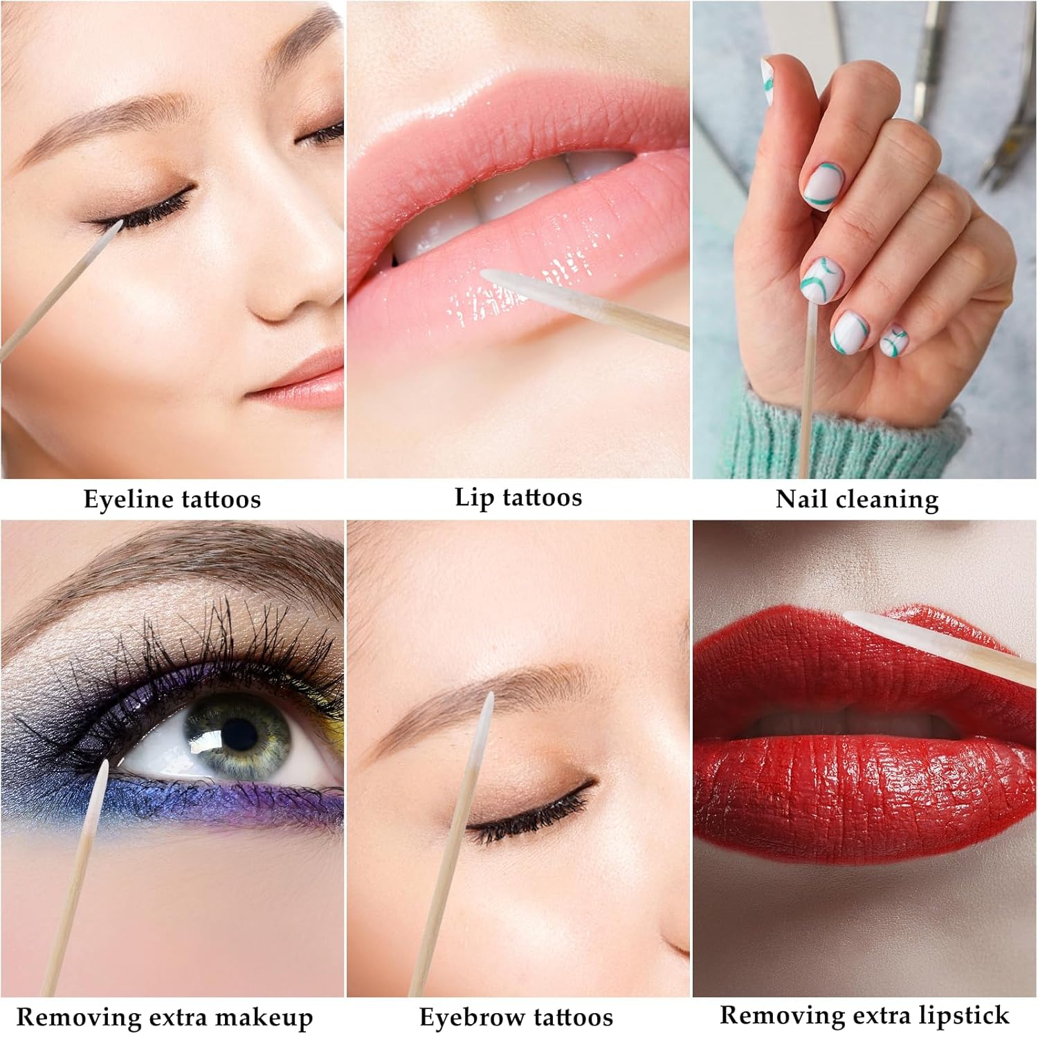 - Pointed cotton swabs used to remove extra eyeliner, eyebrow, and eyeshadow as a makeup remover brush