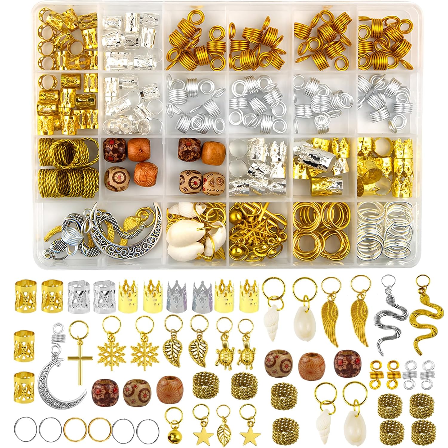 241 PCS Hair Jewelry for Braids and Locs - Metal Gold Silver Clips, Shells, Imitation Wood Beads, Charms, Adjustable Cuffs, Rings for Women and Girls