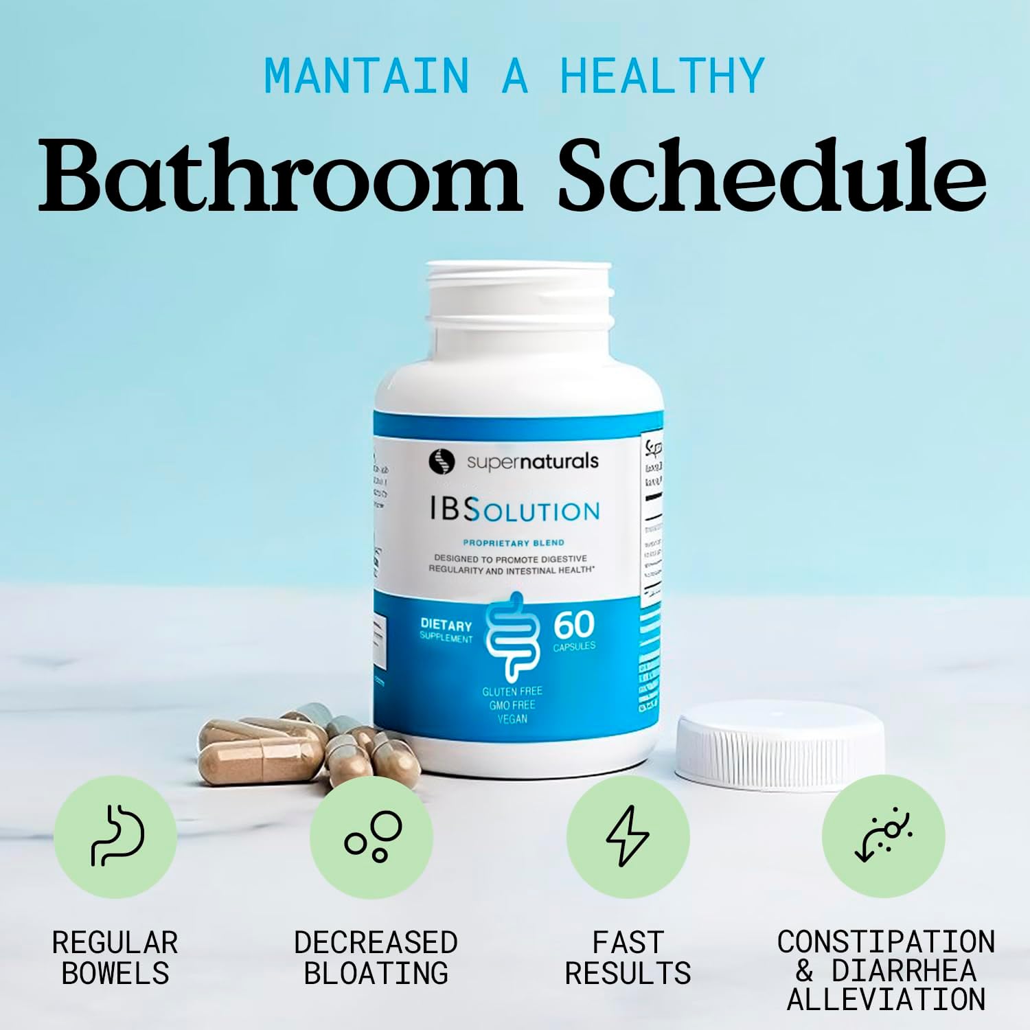 - YOUR GO-TO DIGESTIVE ADVANTAGE FOR 30 DAYS: Formulated with digestive aids and naturally occurring superfoods, a bottle of our 60-Count IBSolution capsules is enough to last you 30 days! Do you go 9 times a day or don’t poop for several days? Feel panicked about where the nearest bathroom is all the time? For maximum symptom support, take one tablet twice daily (in the morning and evening).