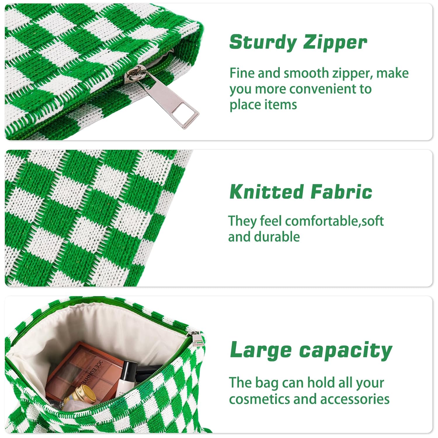 - LIGHT WEIGHT AND EXCELLENT WORKMANSHIP: The cute makeup pouch is made of soft knitted fabric and is comfortable, soft and lightweight. Checkered travel make up bag folds up when not in use and fits in a large bag without taking up space. The metal zipper of the cute pencil case keep your items secure and organized inside. Cosmetic bag accessories set for women