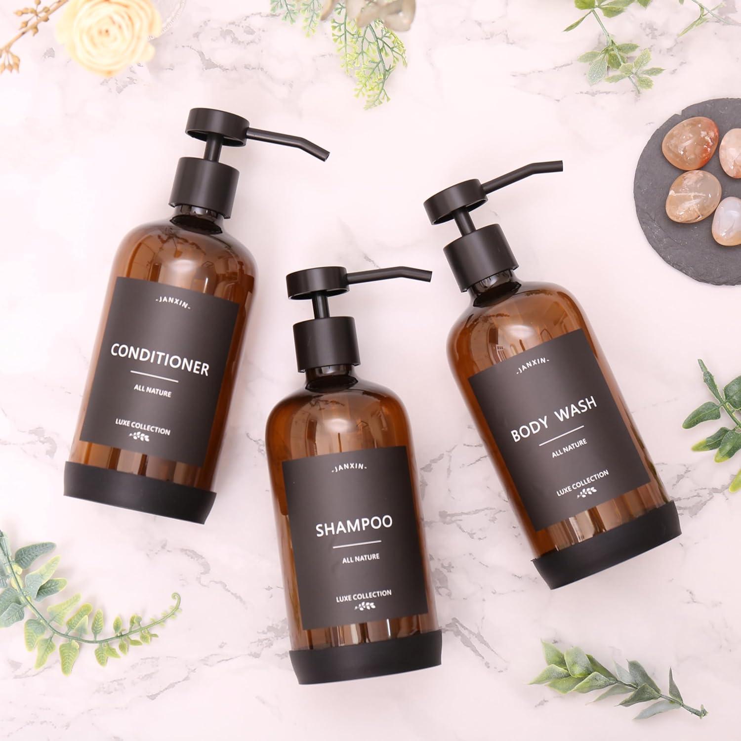 Shampoo and Conditioner Dispenser Set of 3,Refillable 21oz Shampoo Bottles with Non-Slip Protective Silicone Pad,Shower Soap Dispenser with Waterproof Labels for Bathroom (Amber)
