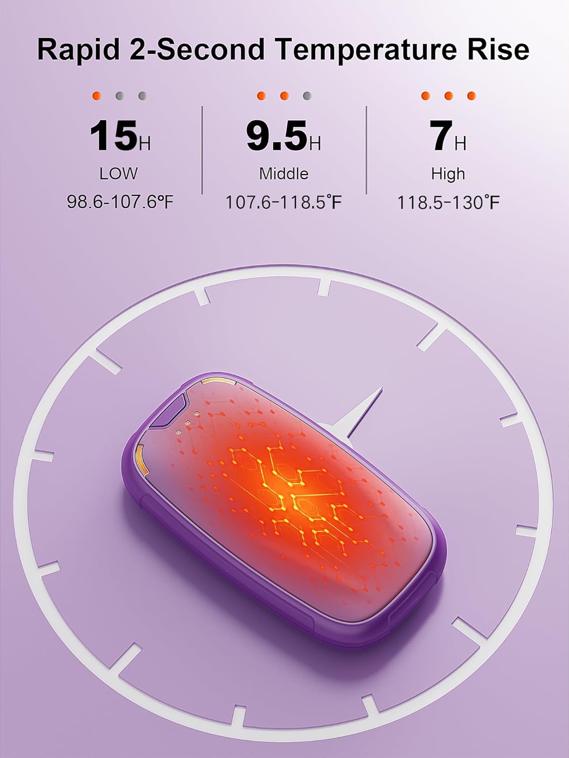- 【Rechargeable & Three Levels of Temperature】Electric hand warmers, 5200mah rechargable hand warms with up to 12 hours battery life, USB hand warmer. With 3-speed indicator light, you can adjust three different temperatures, the use of time is 7-9.5-12 hours. Choose the right temperature for a comfortable using experience.
