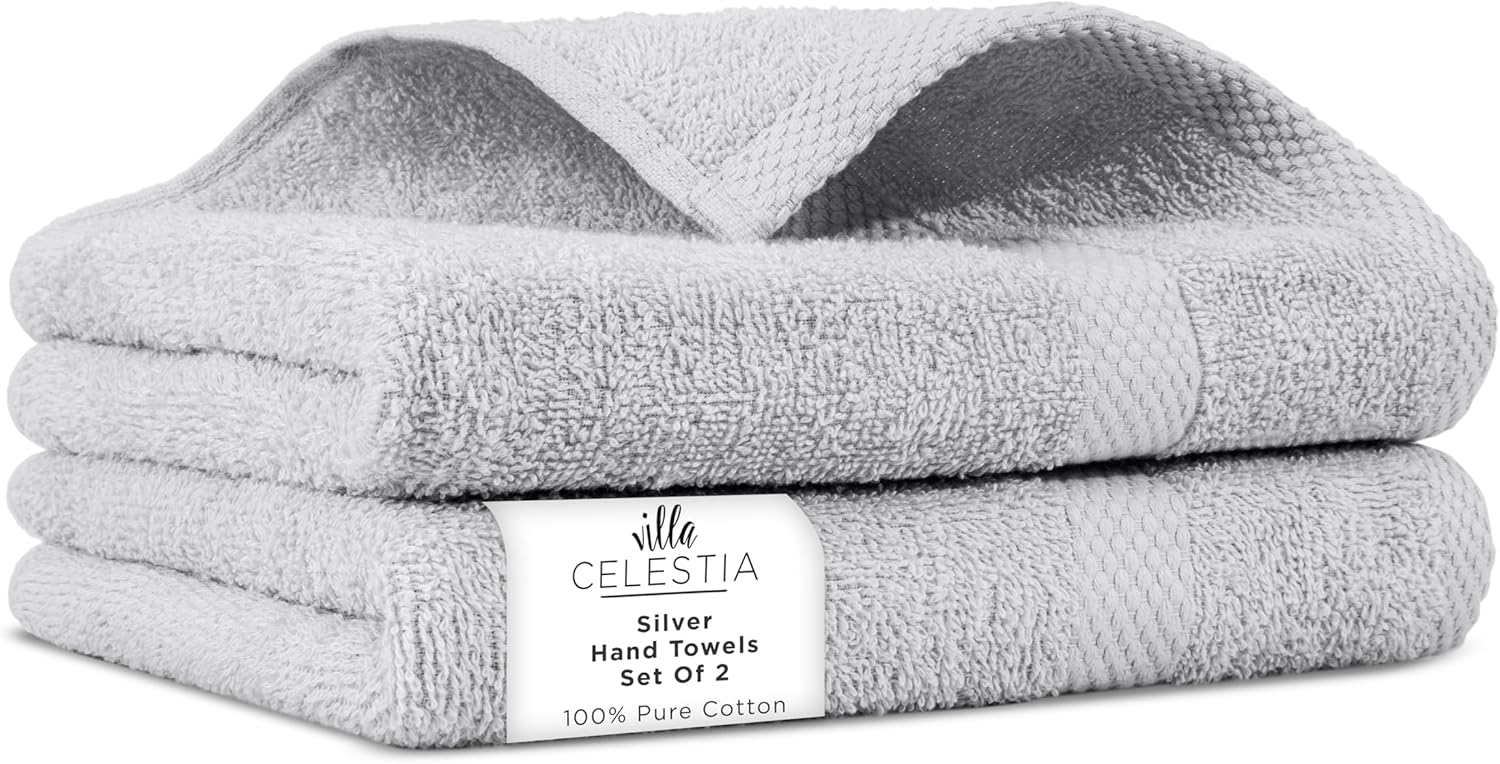 100% Cotton Hand Towel Set of 2, (16 x 28 inches) Sustainable, Soft, Highly Absorbent, Quick Drying, Combed Cotton Hand Towels Pack of 2 Ideal for Hotels, Spa, Bathroom, Dorm, Silver