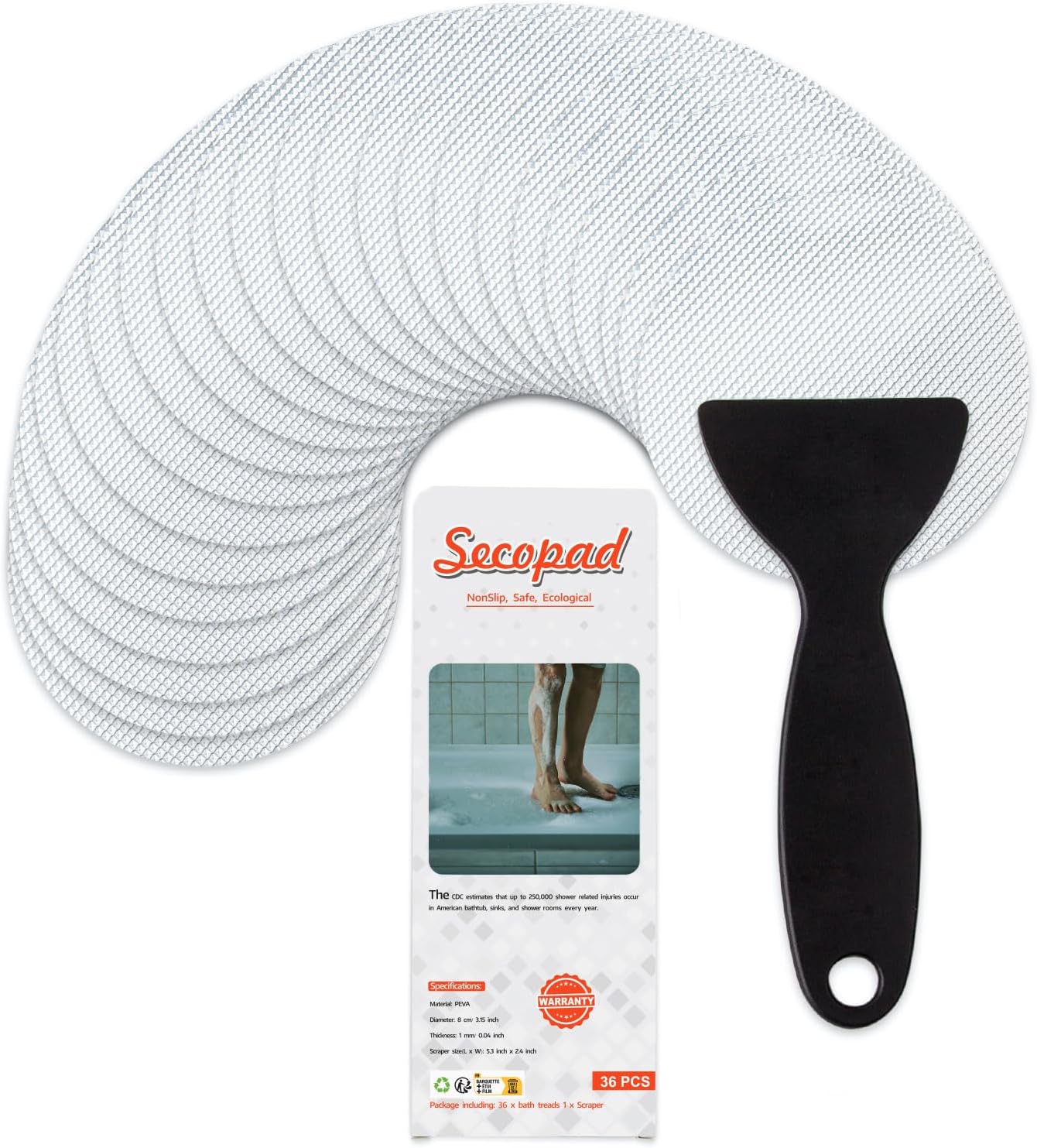 - The package comprises 36 pieces (diameter 8.0cm or 3.15-inch) of clear stickers alongside 1 high-quality silicone scraper. Ideally, the 36 stickers should occupy the whole surface thereby reducing the risk of accidental slips. On top of that, you can even use these stickers on the stairs to make them much more secure.