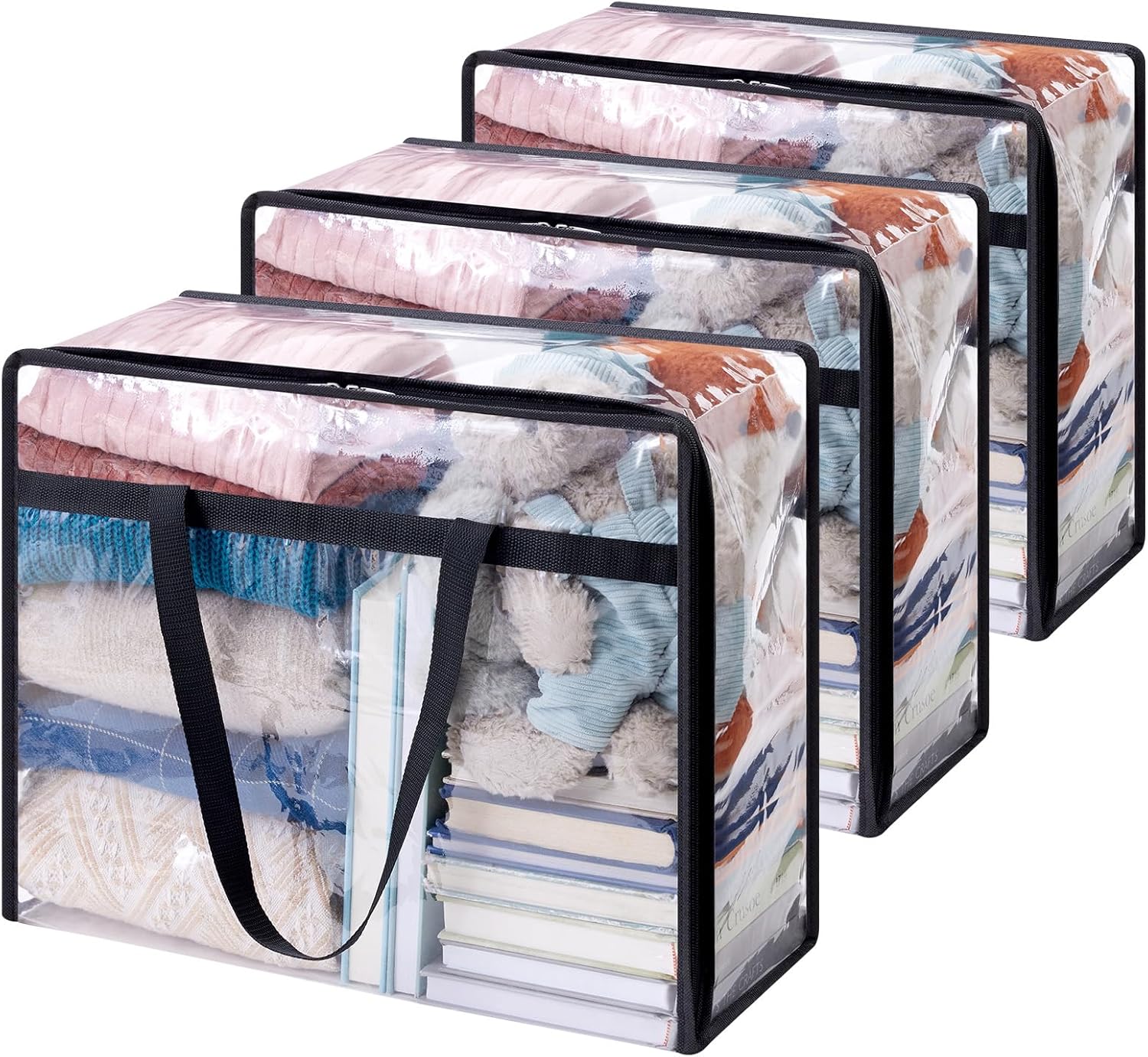 - Easy to Use: The storage bins with lids feature reinforced carry polyester webbing handles for enhanced durability. With their ample length, these handles allow for easy one-handed carrying or convenient shoulder transportation. The transparent color of the comforter storage bag enables effortless visibility, allowing you to quickly locate and access your belongings.