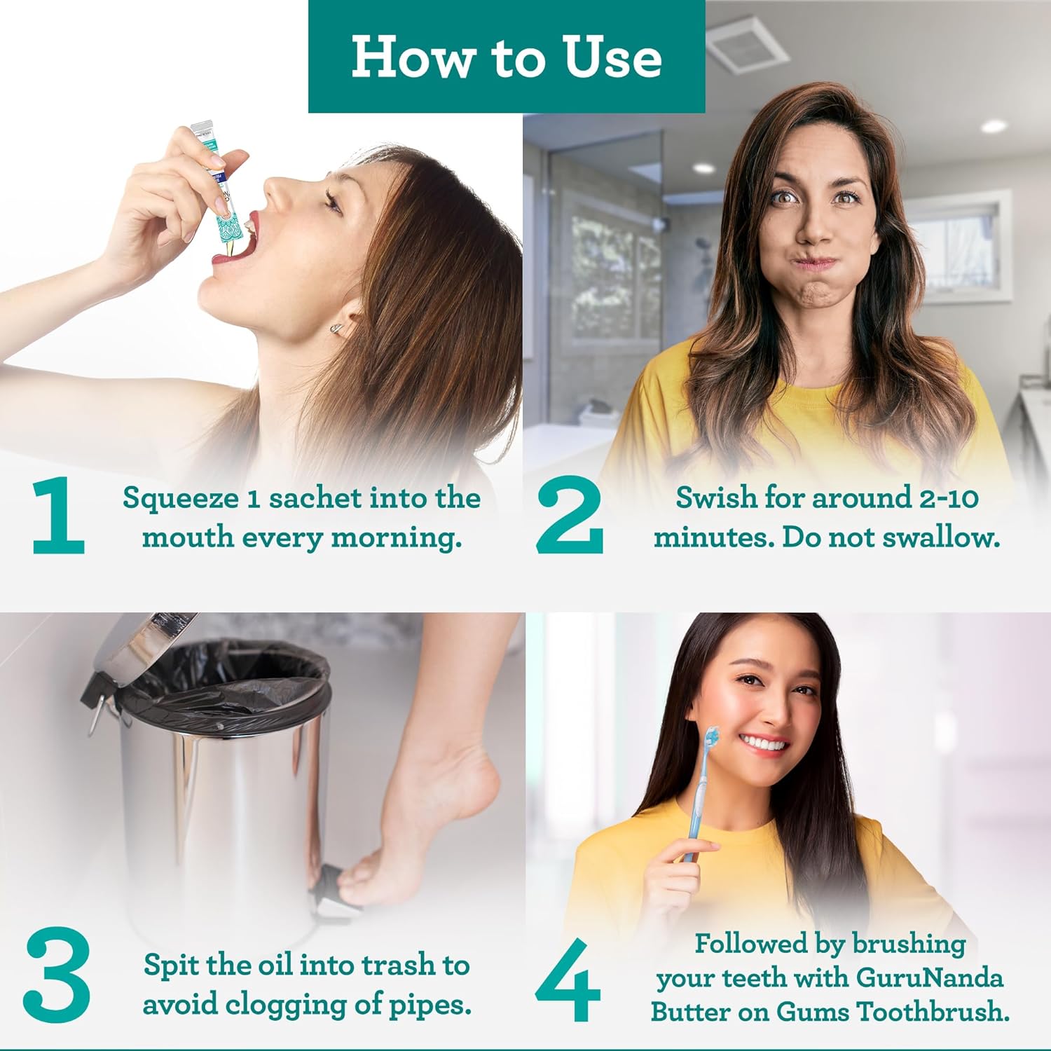 - This convenient, pre-mixed sachet requires no measuring—just tear open the sachet, squeeze the oil into your mouth, and start swishing. Swish for 2 minutes, gradually working your way up to 10 minutes. DO NOT SWALLOW. Spit the oil into the trash to avoid clogging pipes. Follow up with brushing your teeth using the GuruNanda Butter on Gums Toothbrush for the best results.
