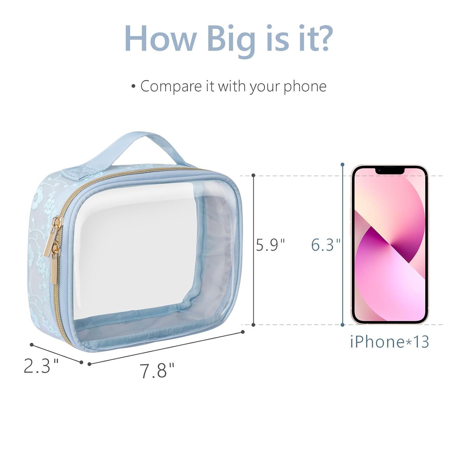 PACKISM TSA Approved Toiletry Bag - Floral Texture Lace Clear Makeup Bags, Ease of Clamshell Closing, Handles and Double Zippers, 0.5 mm Thicker Clear Toiletry Bags, Good for Travel, Blue