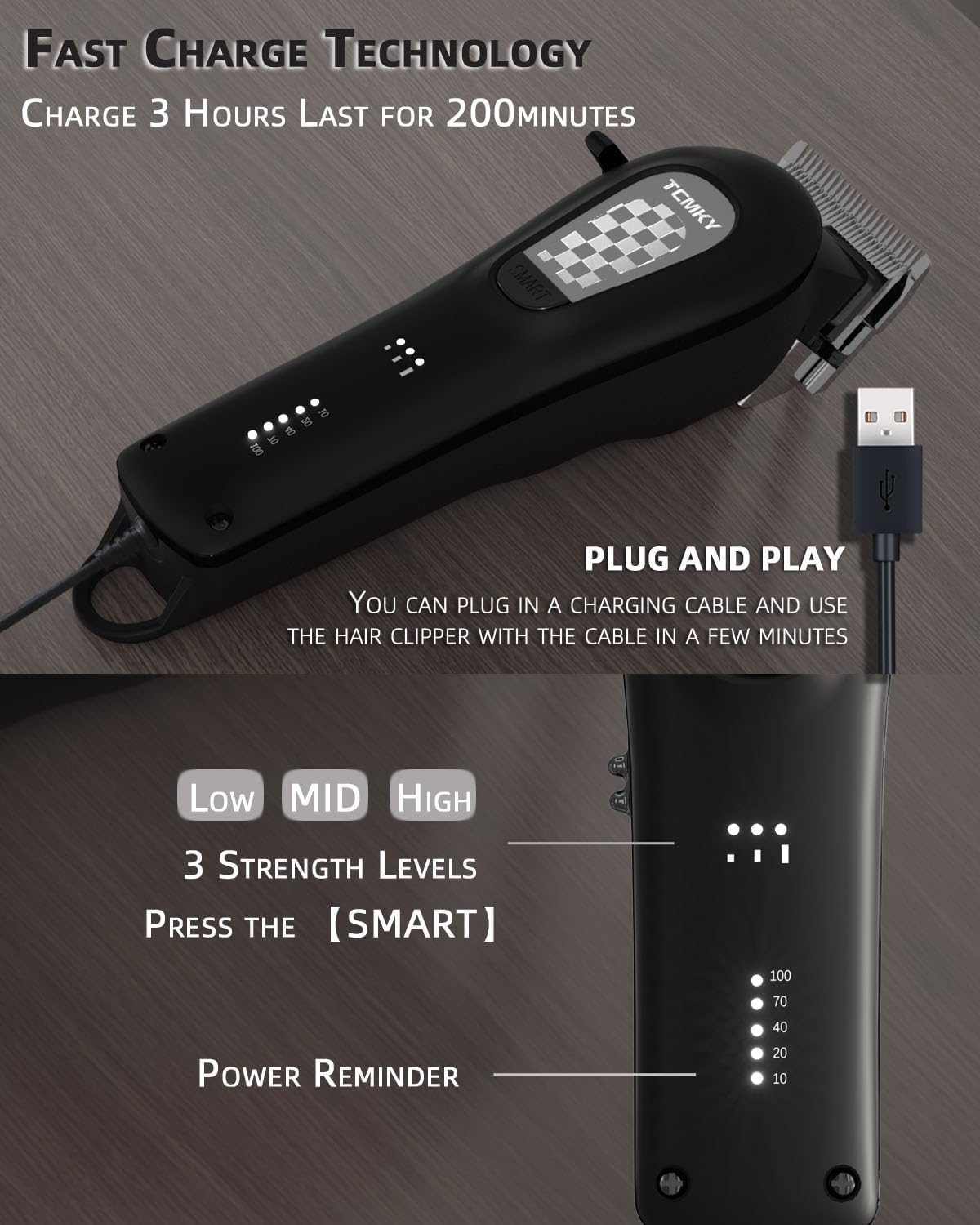 - CORDLESS&CORDED TCMKY Hair Clippers can be with cord or cordless which is super convenient for self cutting. Universal charging One full charge Last up to 200 minutes of use.When the power of the hair clipper is used up.This Dog hair trimmer supports plug and play.When charging. The five indicators light up in the form of running lights from bottom to top. When the five indicators become normally on.The power is full. At this time.the charging wire can be pulled out.