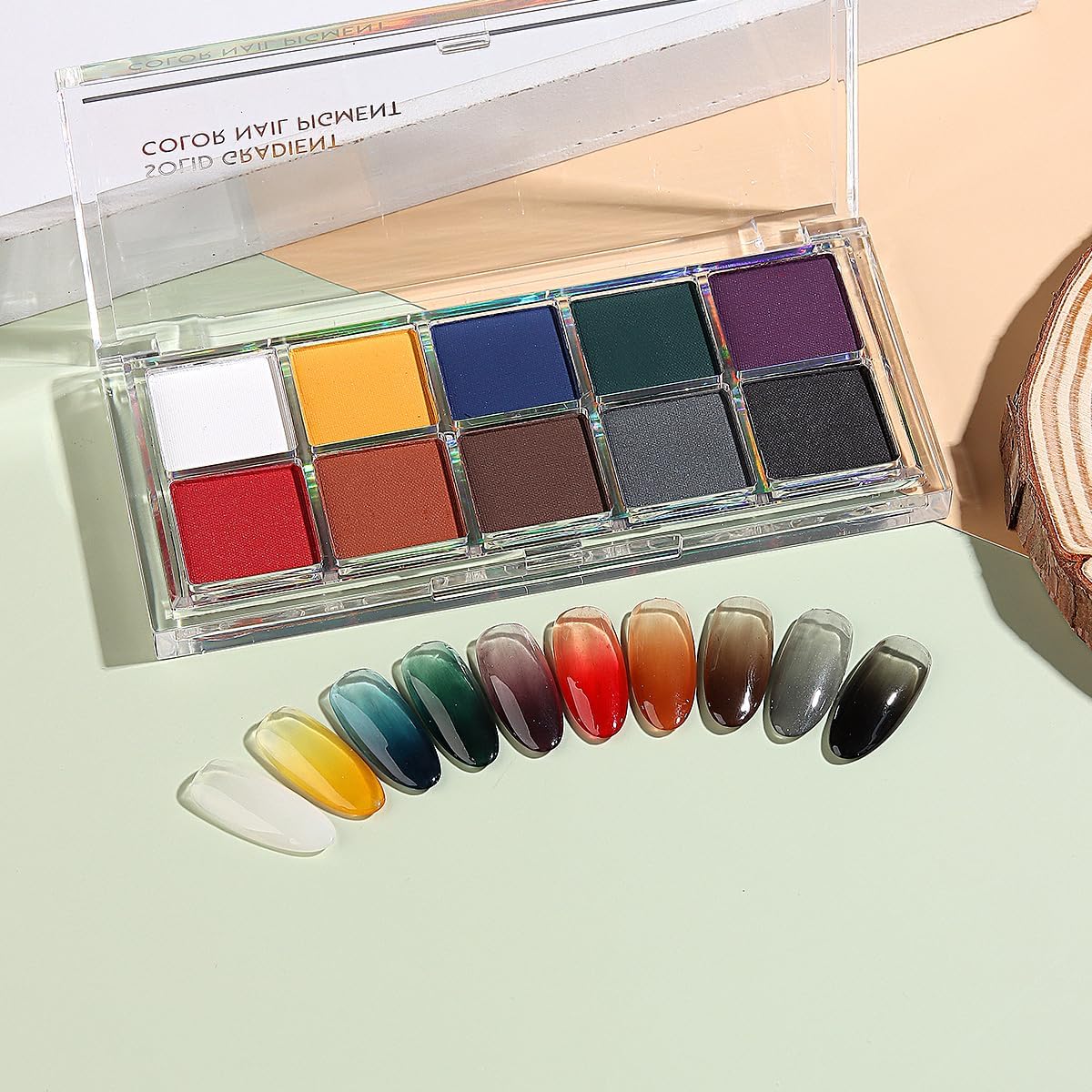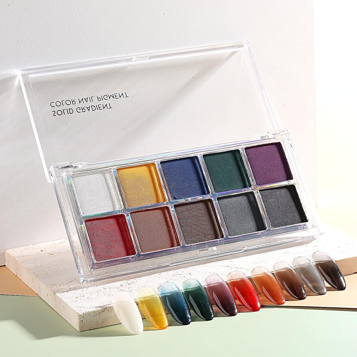 - 【YOU WILL GET】 10 colors in one palette solid nail powder and 10 doubled-head sponge sticks for rubbing nail pigment.